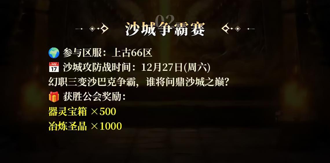 2. 沙城争霸赛:12月27日开启沙城攻防战,获胜公会可拿下器灵宝箱×500+冶炼圣晶×1000,公会组队征战,稀有资源轻松入手!