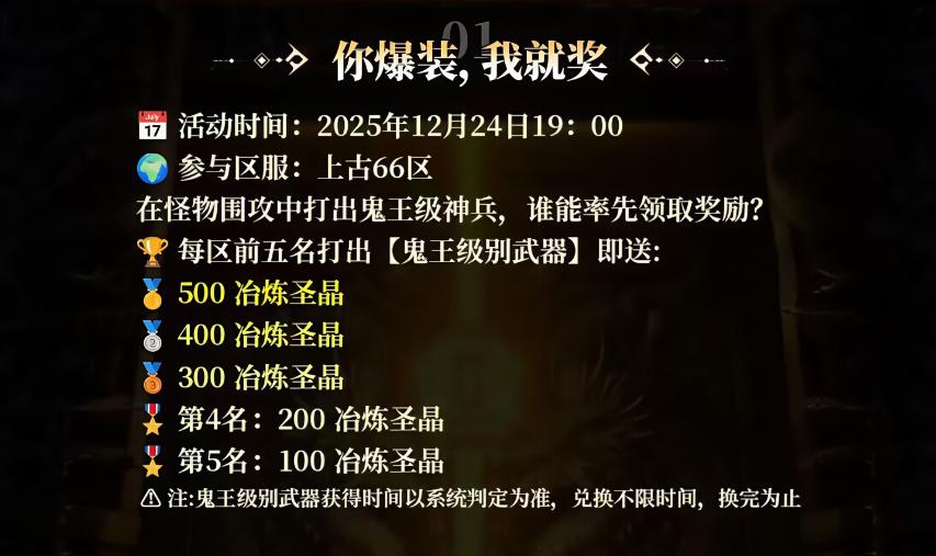 1. 你爆装,我就奖:12月24日19:00,在怪物围攻中打出鬼王级神兵,每区前五名就能领取冶炼圣晶(第一名500个、第二名400个、第三名300个、第四名200个、第五名100个),系统判定获取时间,兑奖不限时,兑完为止!