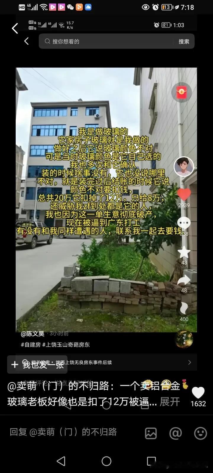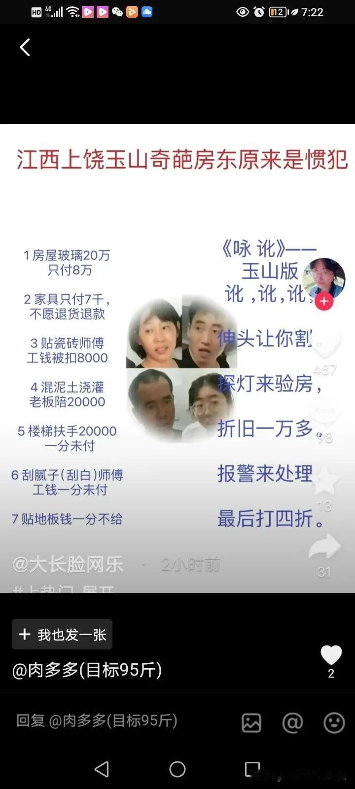 江西玉山奇葩房东用探照灯定损讹钱事件越闹越大,参与过这幢自建房的受害者都纷纷高举身份证爆料,从地基到装修真是无一幸免都被讹了。 这房东的所作所为,简直惊呆了我,这简直是空手套白狼啊!一套房子全靠讹,全靠扣,如果只是一个人来举报,那我还觉得有可能我们误会他了,但是这一堆人扎堆举着身份证来举报啊,难道全都是假的吗? 这真的是心黑呀,希望相关部门能够介入调查一下,辨别清楚真假,不冤枉好人,也不要放过坏人,如果这都是事实的话,请归还他们的血汗钱。