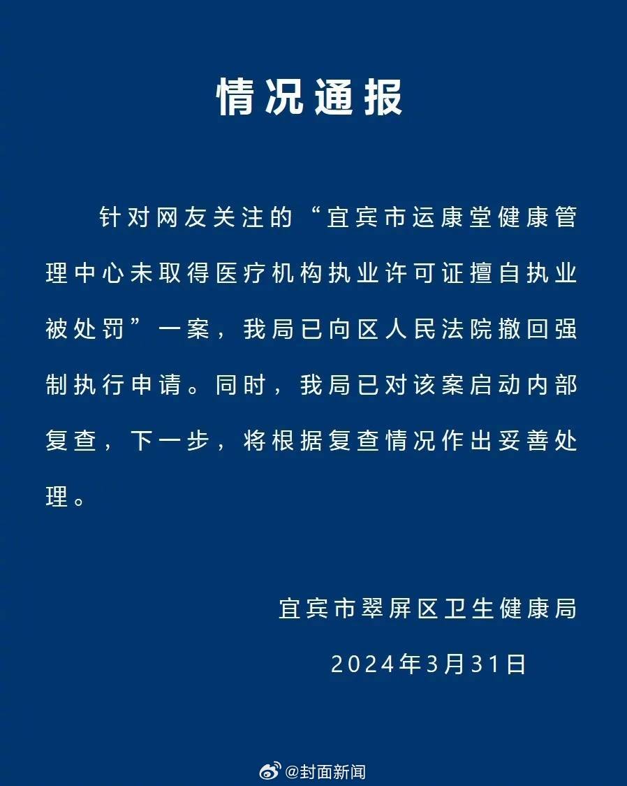 【#被罚22万采耳店主仍认为处罚过重# 法院已同意撤回强制执行申请】#采耳店被罚22万一案启动内部复查# 近日,四川宜宾一家采耳店被指无证诊疗被罚22万,引发网友关注。4月1日,记者从四川省宜宾市翠屏区人民法院获悉,法院已同意宜宾市翠屏区卫生健康局撤回强制执行申请。