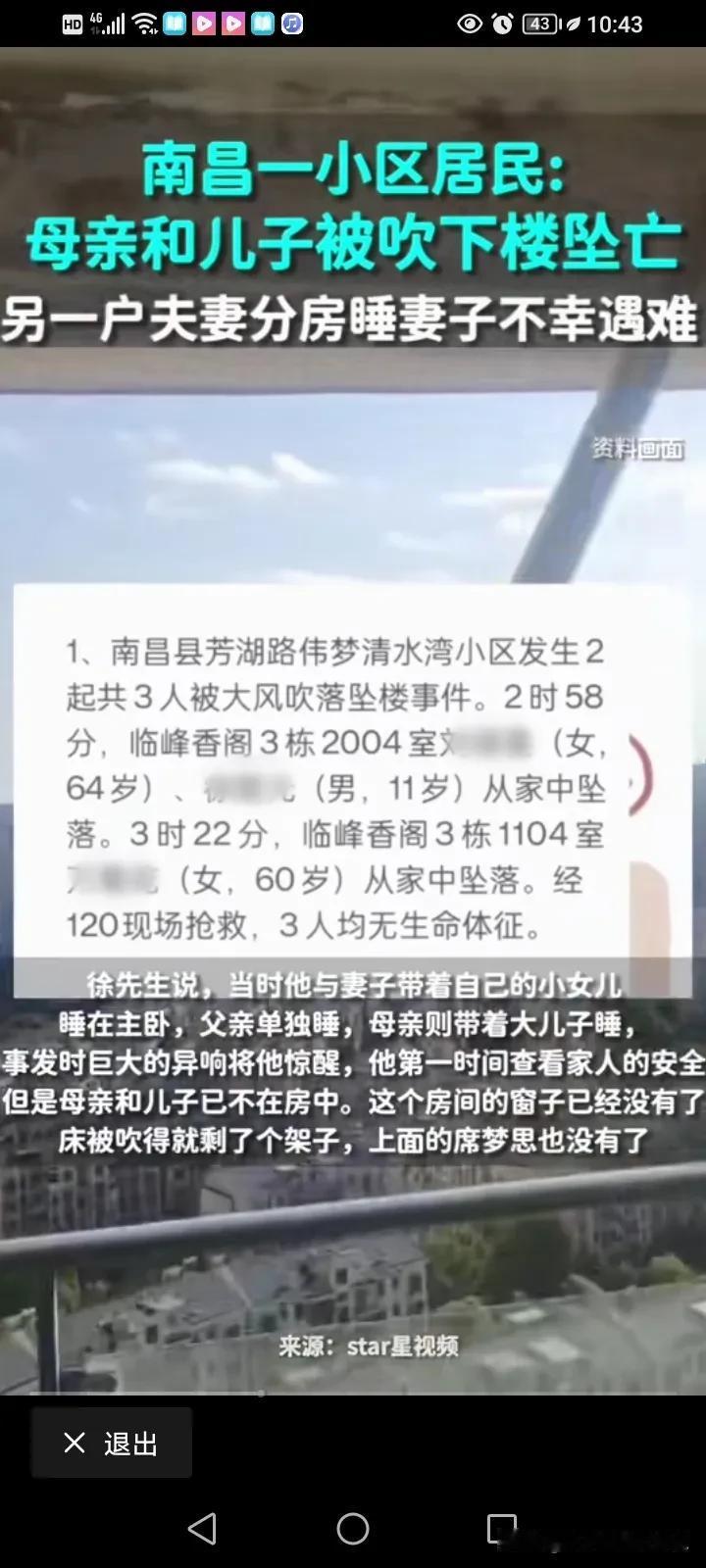 听说南昌的大风导致死了4个,伤了10个,有3个是直接从高层吹下去的,其中有一户是64岁的老太太和11岁的男孩连人带床垫吹下去,还有一个60岁的同一个小区的,也是人没了。 一开始我还真的觉得到底是有多大的风啊,会连人带窗户,带床垫吹下去,但是后来看的报道,说这个风有11级,那是可以吹船,拔树,断电线杆的。 然后我再看到这个视频,我真的惊呆了,就是那么一瞬间,风就吹破了玻璃,还好孩子离得远一点,不然后果不堪设想! 重点是指的是四个人当中三个人是在同一小区了,两户人都被吹下去了。这门窗质量还过关吗?这小区应该都人心惶惶了吧。 #记录我的2024# #我来唠家常#