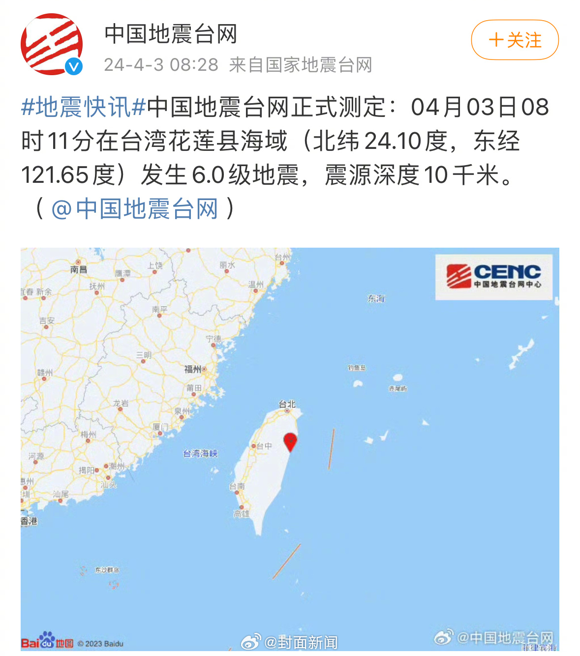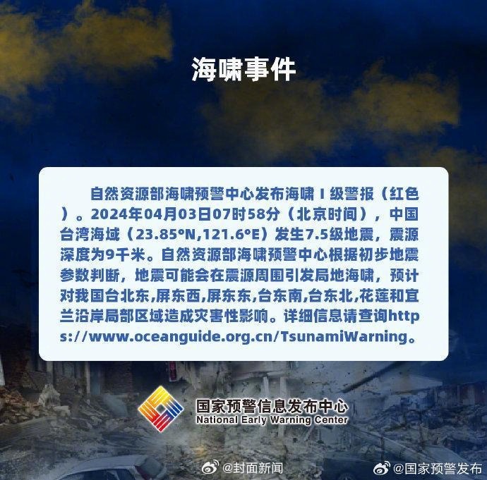 【海啸Ⅰ级警报!#台湾花莲海域连发两次强震#】中国地震台网正式测定:04月03日08时11分在台湾花莲县海域发生6.0级地震,震源深度10千米。此前,据中国地震台网正式测定:04月03日07时58分在台湾花莲县海域发生7.3级地震。 自然资源部海啸预警中心发布海啸Ⅰ级警报(红色)。自然资源部海啸预警中心根据初步地震参数判断,地震可能会在震源周围引发局地海啸。