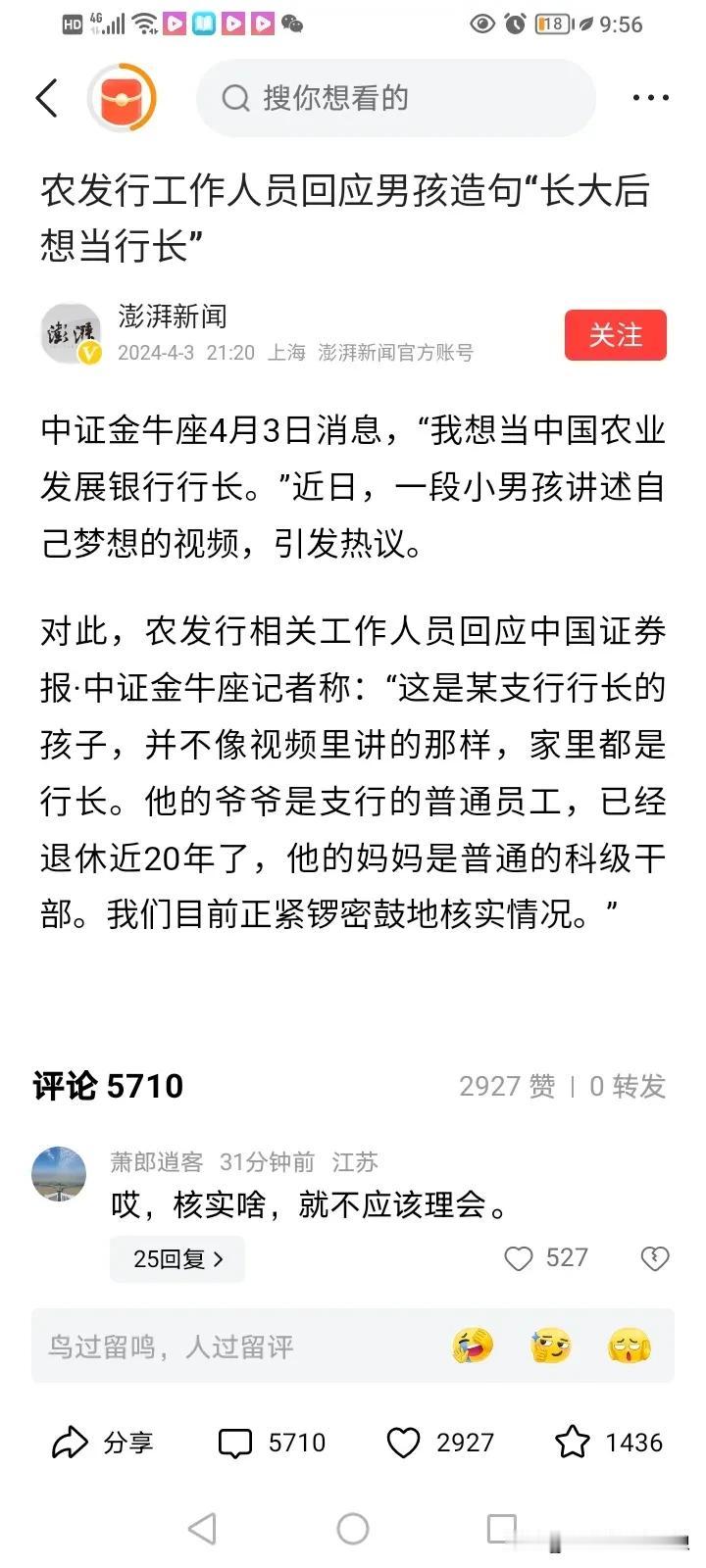 孩子想当中国农业发展银行的行长这件事情,错的是老师吗?错的是孩子吗?其实都不是!很多人在说,谴责的不应该是想做行长的孩子,而是发出这个视频的老师,说老师没有师德怎么可以把这样的视频发出去,而不是教育孩子呢? 好的学校老师都会时不时分享教学时的趣事到班群里,本来就是没有其他的想法,纯粹是分享,而发到互联网上不一定是老师,有可能是家长。 在这里我想说的是,不论这个孩子,老师,还是发到互联网上的那个家长?他们都有错吗?错的不是这个社会? 全民所有成了个别人的家传祖业难道正常?人家说当行长关健是还真的行。 一个支行行长的孩子就认为银行是他家开的,还可以,祖祖辈辈的去继承,请问家里的教育没有问题吗,孩子真的是说出了实情,如果是爷爷、爸爸、妈妈、都是银行行长,这个确实有违行业和国家规定,正常同一个单位禁止有直系亲属在一起工作,那不应该查吗? 很多人谴责那个发视频到互联网上的人,他真的是错了吗?这不是事实吗?网民没有检举揭发的权利吗?就法律而言侵犯了别人的隐私,小孩家人可以依法起诉。 很多人说为什么不私底下发给该单位的纪检部?这种事确实挺难的,发网上肯定涉嫌违法了,但是如果直接发给纪委又是什么样的结局呢? #我来唠家常# #春日生活打卡季#