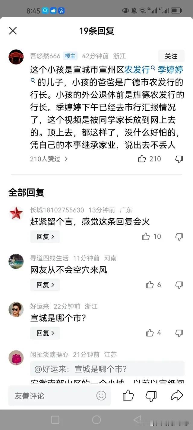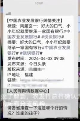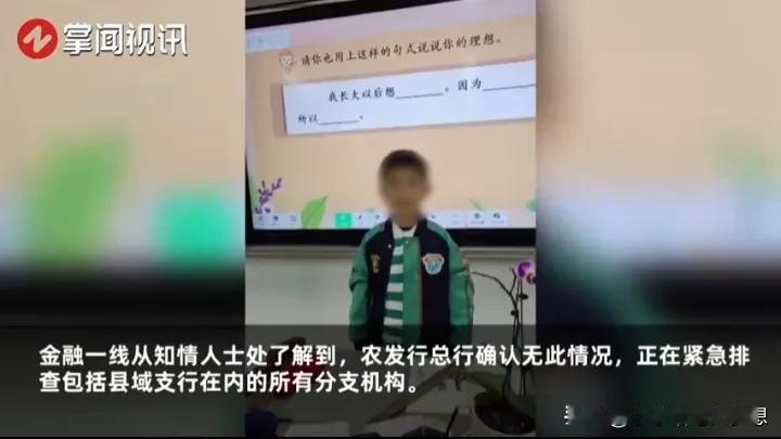 孩子谈理想,说:“我想当中国农业发展银行行长”的一则视频在网上引起了轩然大波,网友爆料了更详细的情况,孩子是安徽那边的,孩子妈妈已经去市里交代实际情况,孩子所说的情况基本也是属实的。 事情发生后,中国农业发展银行总行进行了排查,不是总行行长的儿子,然后发通知,请各支行分别排查是谁家的孩子,要尽快控制舆情。 这位妈妈收到通知之后就去市里报到了,也交代了事情,确实孩子透露的亲人都是银行人。 这种情况是否有违行业和国家规定? 正常同一个单位禁止有直系亲属在一起工作的,但是他这个是不同地点的支行,这种我真的不知道是属不属违规,大家知道吗?