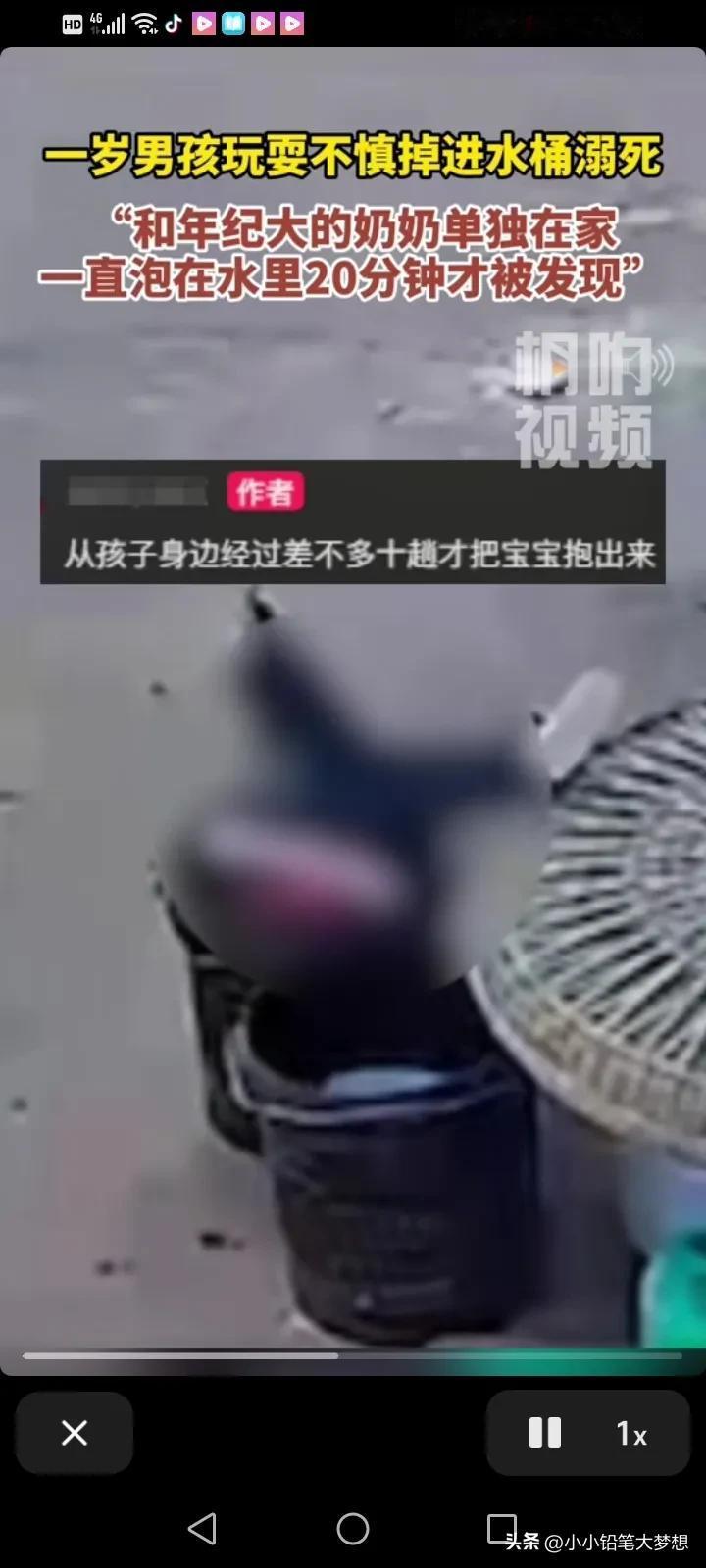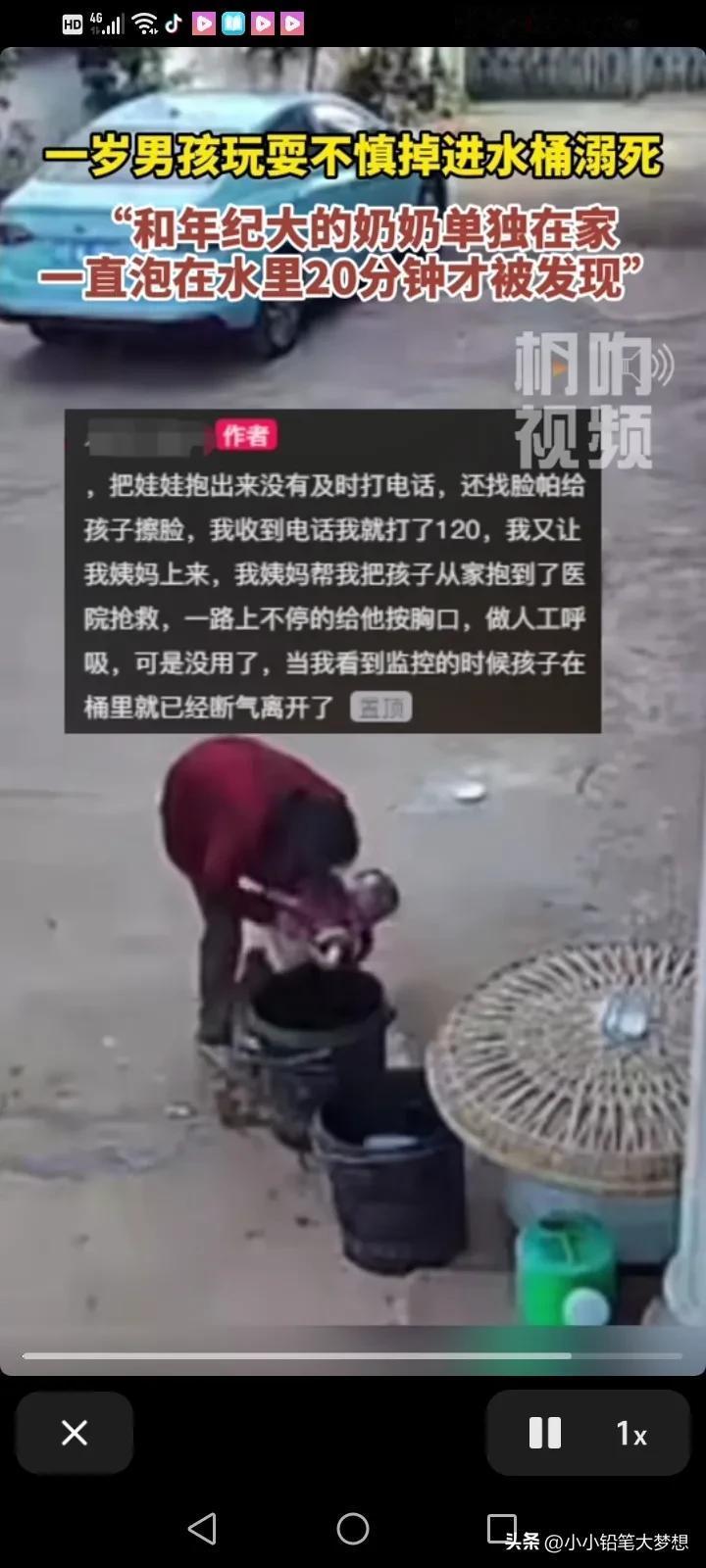 真的心疼死我,奶奶在门口坐着玩手机,小孩掉进桶里20多分钟没发现溺亡了,孩子36分头栽进水里,54分才发现孩子,但是抱起来的时候人已经不行了。 正常家里刚学会走路的小朋友1分钟不见就会担心害怕,十几分钟,对于一个刚会走路的宝宝来说,十几分钟的安静是很可怕的。 当奶奶意识到看不在孩子寻找的时候,她在孩子身边转悠了好多圈,居然没发现,这真的是鬼遮眼了吗? 妈妈才去上班半个月,就发生这样的事情,孩子的妈妈该有多自责,妈妈十月怀胎生下的孩子,如果不是为了让生活更好,又怎么会选择工作,孩子的母亲可能这辈子都会活在痛苦煎熬中,监控拍摄的非常清楚,亲眼目睹了孩子到死亡的全过程。 说真的做为一个外人,我都接受不了,这让母亲怎么释怀,一辈子都释怀不了。 #我来唠家常# #春日生活打卡季#