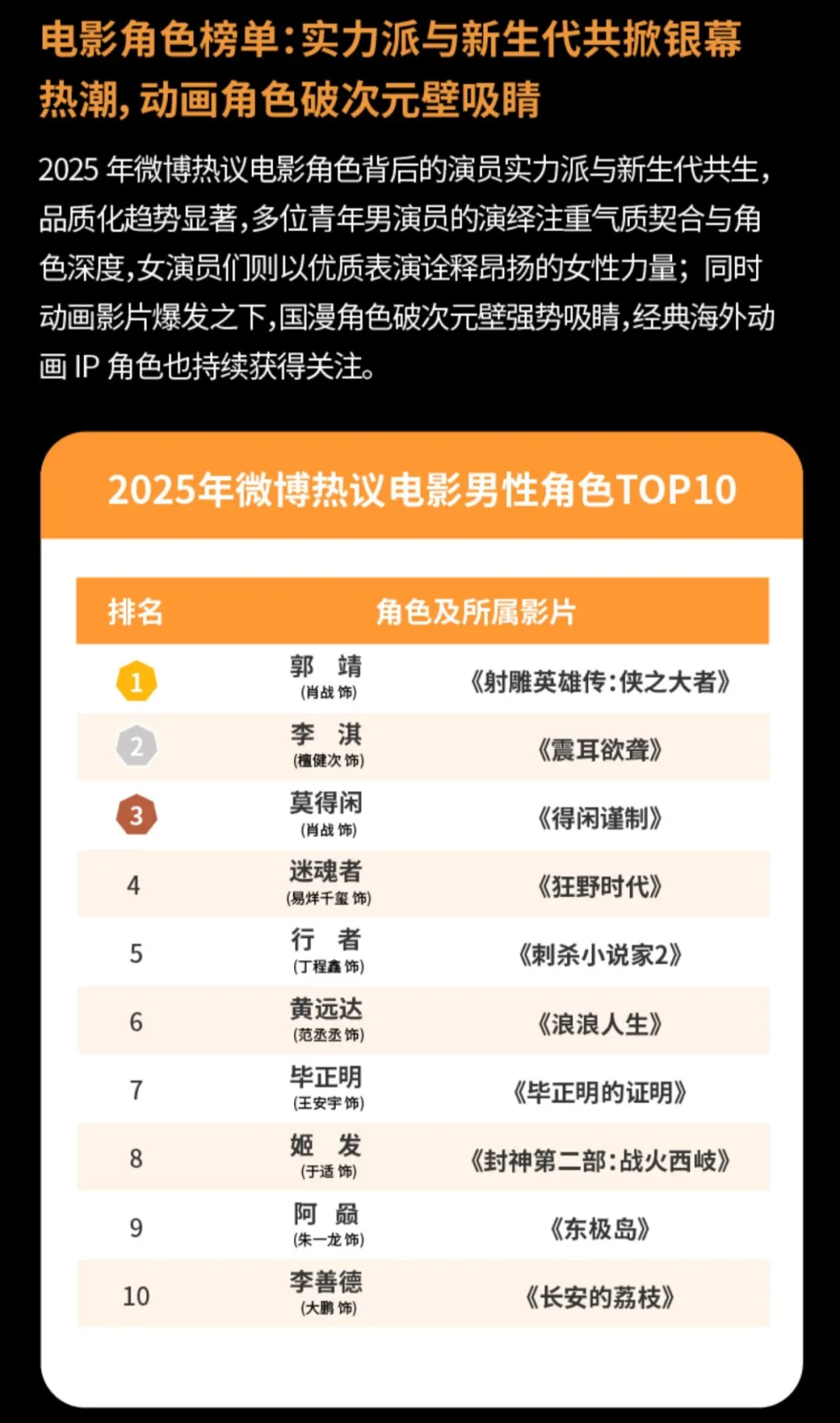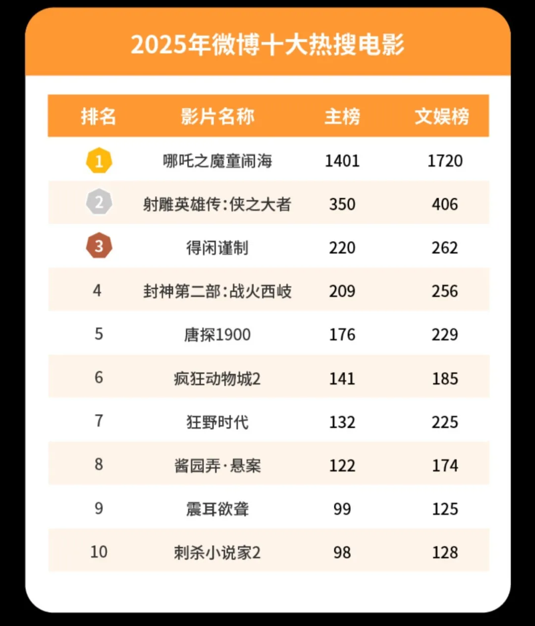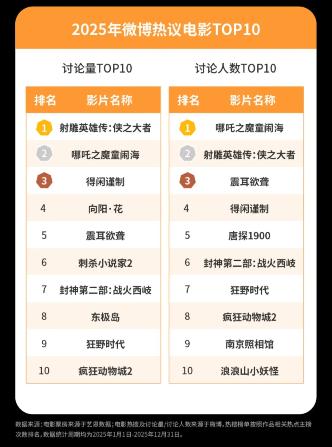 2月3日,新浪微博发布了《2025微博娱乐白皮书》,通过明星、电影、剧集、综艺、纪实人文、音乐与演出、海外娱乐、艺人扶持八大版块全方位解析中国娱乐产业。乌尔善执导神话史诗《封神第二部:战火西岐》入围2025年微博十大热搜电影,其他上榜影片包括《哪吒之魔童闹海》《射雕英雄传:侠之大者》《得闲谨制》《唐探1900》《疯狂动物城2》《狂野时代》《酱园弄·悬案》《震耳欲聋》《刺杀小说家2》。