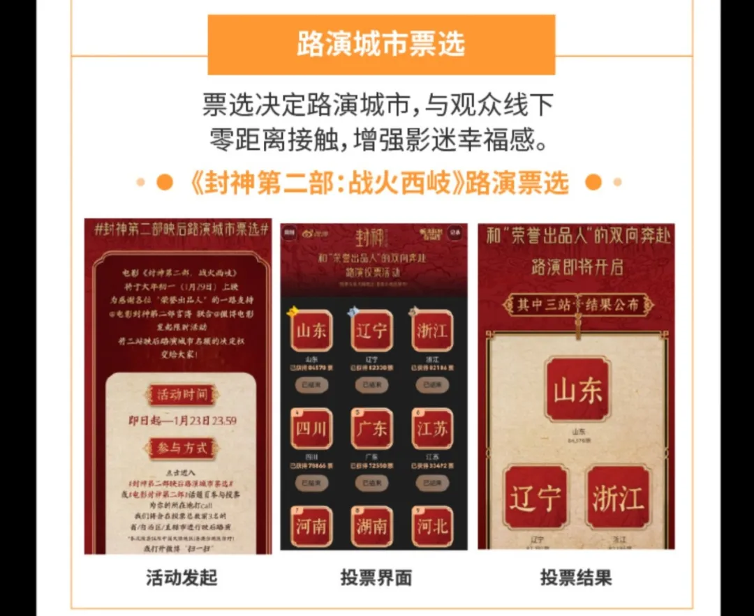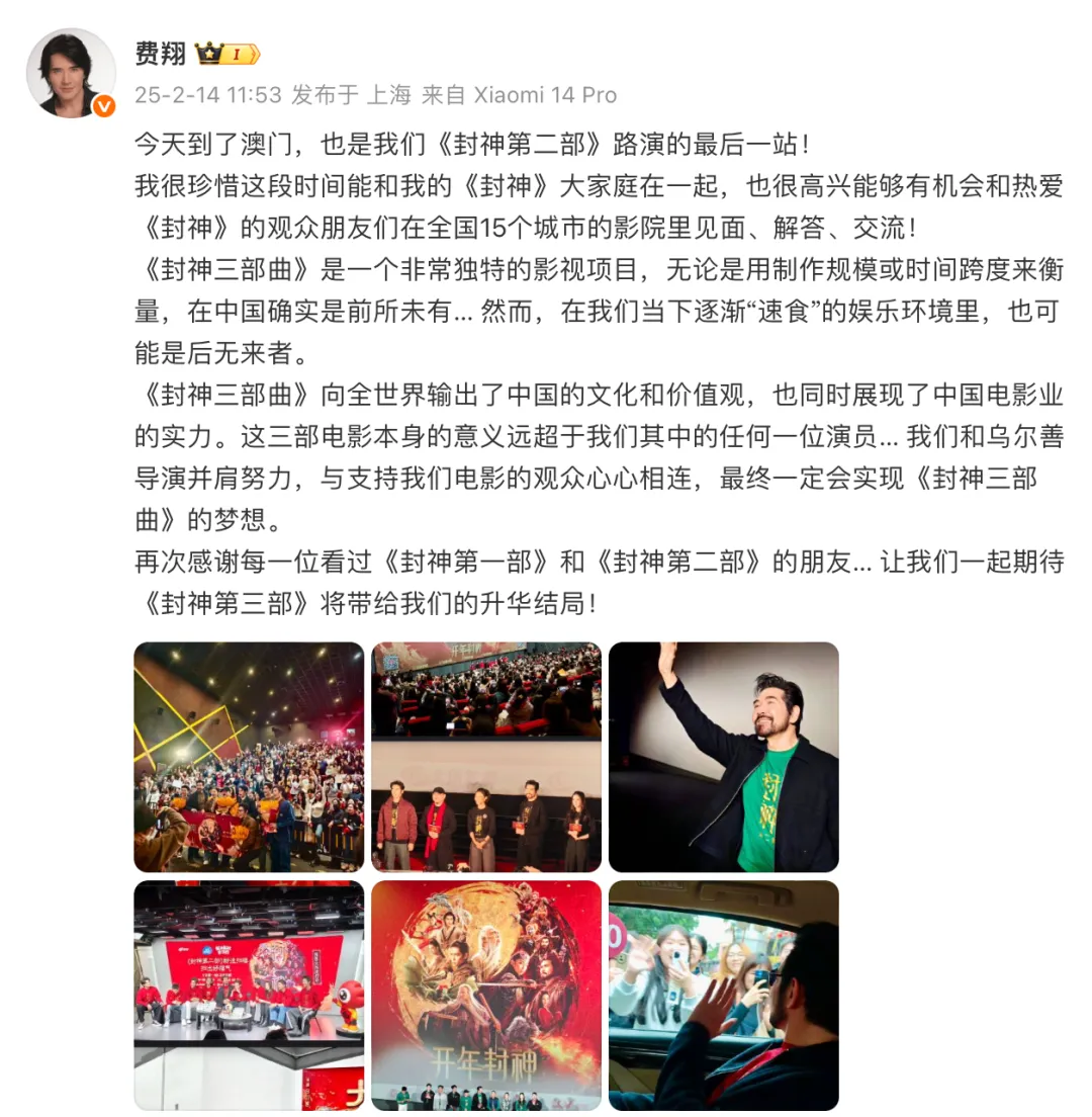 在《封神第二部》路演收官站,演员费翔就在微博上向观众影迷们深情告白:“今天到了澳门,也是我们《封神第二部》路演的最后一站!我很珍惜这段时间能和我的《封神》大家庭在一起,也很高兴能够有机会和热爱《封神》的观众朋友们在全国15个城市的影院里见面、解答、交流!”