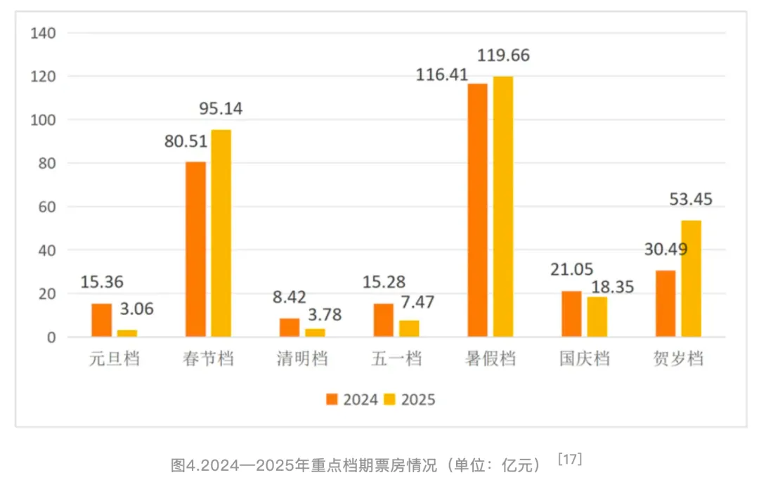 从全年市场走势来看,2025年中国内地电影市场呈现明显的大起大落态势。在各个档期中,春节档表现突出。这一档期从1月28日开始,持续到2月4日共八天,收获电影票房为95.14亿元,同比增长约18%;观影人次为1.87亿,同比增长约14%,均创造了同档期新的纪录。其中大年初一(1月29日)票房达到18.05亿元,观影人次3515.12万,创造了新的单日票房和观影人次纪录;大年初一到大年初七的单日票房连续7天突破10亿元,刷新中国影史纪录。