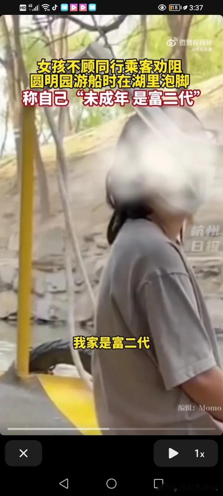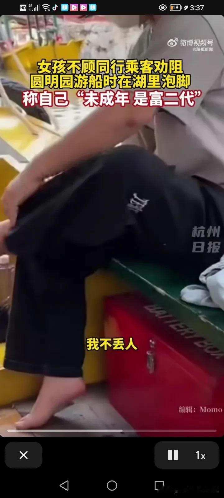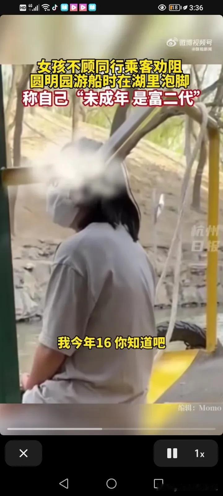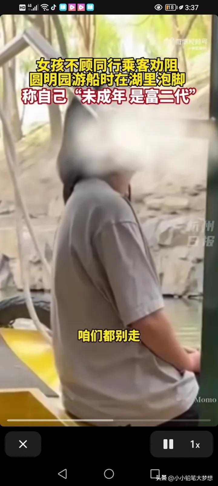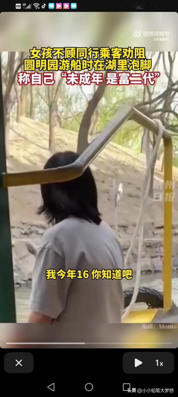 “凭什么管我?我就是这样的素质,我没成年,我家有钱,我是富二代”,简直太狂了!近日,一个女孩火了,她在北京圆明园乘船游玩的时把鞋子脱了,把脚伸进去泡着。 同船的工作人员和游客跟她说,不要只这样做,太危险了,赶紧把脚伸回来吧。 可是这名女孩却特别狂,一听到别人批评她就回怼:“我没成年,我只有16岁,我家是富二代,我家有钱,这船别开了,大家都别走。” 大叔说这是违反规定的。 女孩说:“反正罚的是你,又不是我,我不觉得丢人,你告我去吧!” 同行的人对这名女孩说:“你都16岁了,没没上过学吗?” 后来她的情绪激动说,如果不让她泡的话,她会跳下去! 景区的工作人员再三的强调,在船上面脱鞋泡脚是不允许的,这太危险了,也不是文明的行为,游客要自觉遵守。 后来这女孩靠岸就走了,还骂骂咧咧的。 未成年赶快重新定义法律吧,这真的很吓人。 我想说女孩子,你家可能不缺钱,但是你真的是缺教养! #春日生活打卡季#