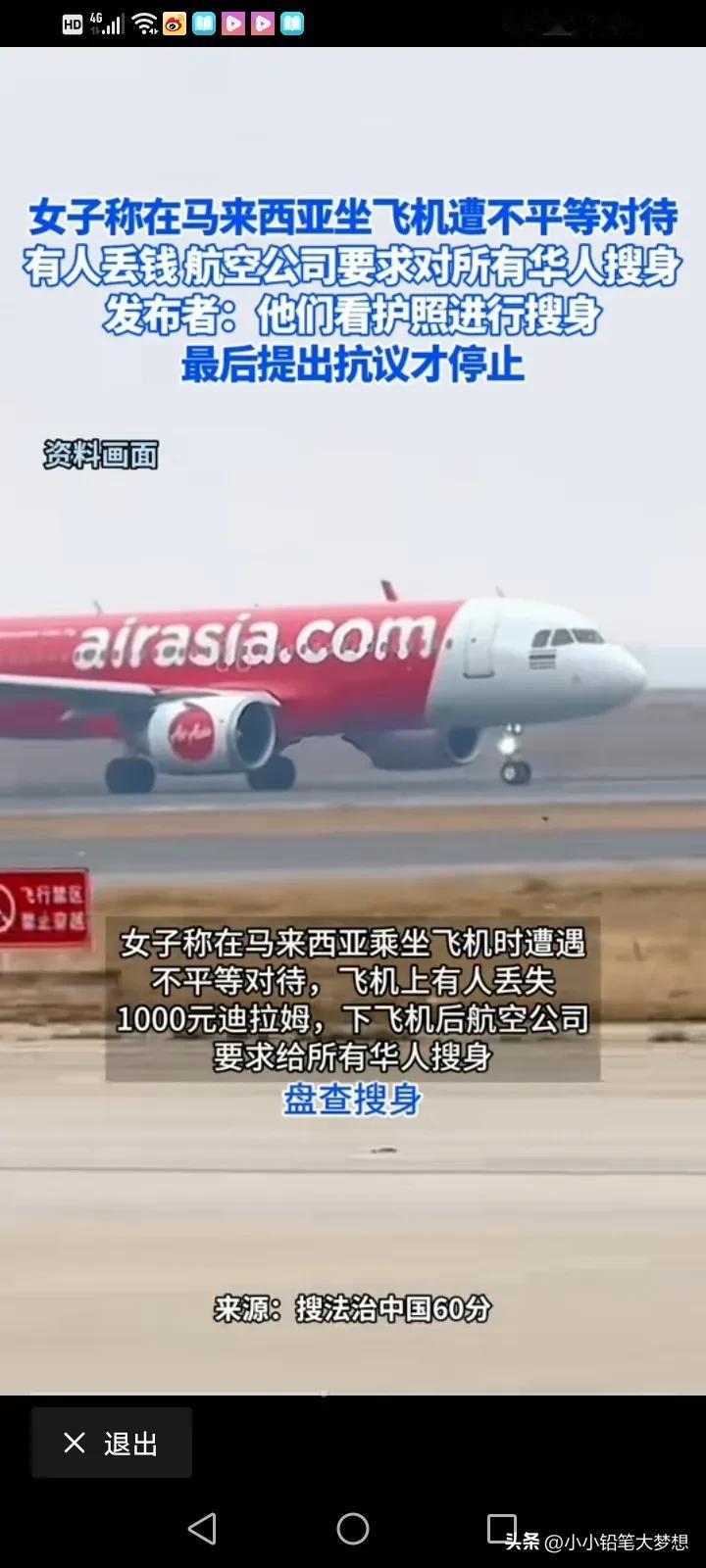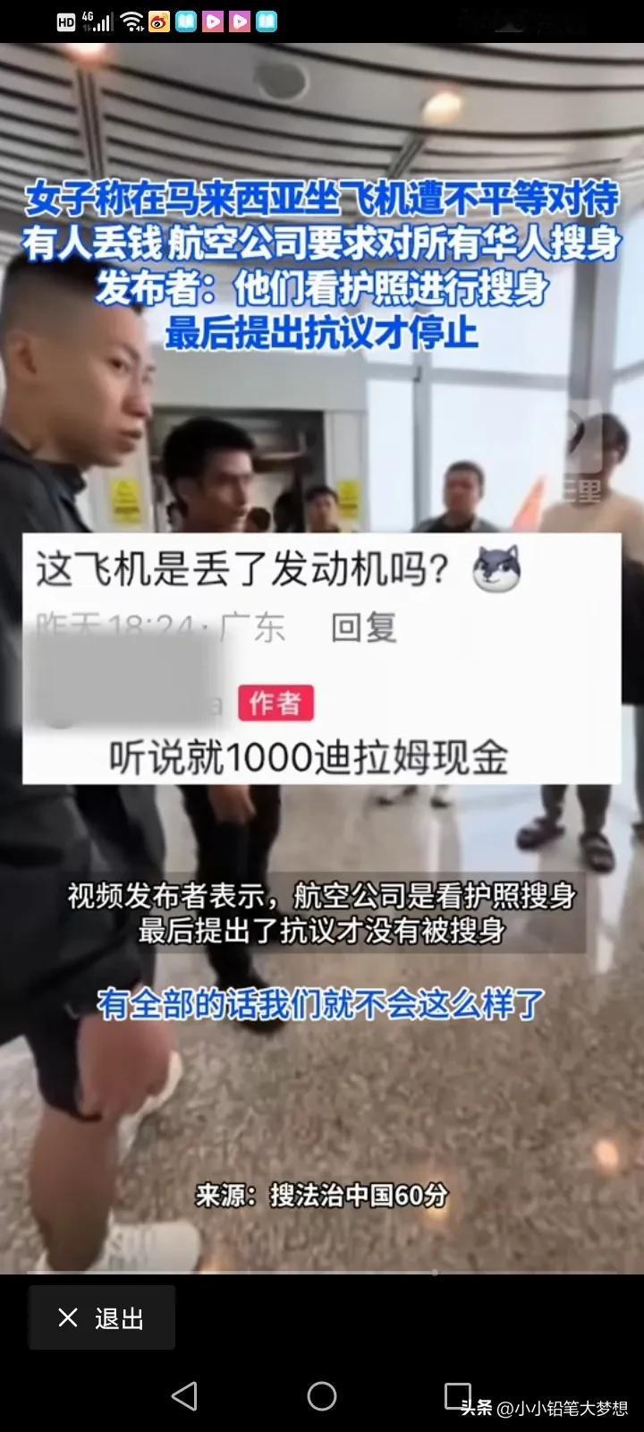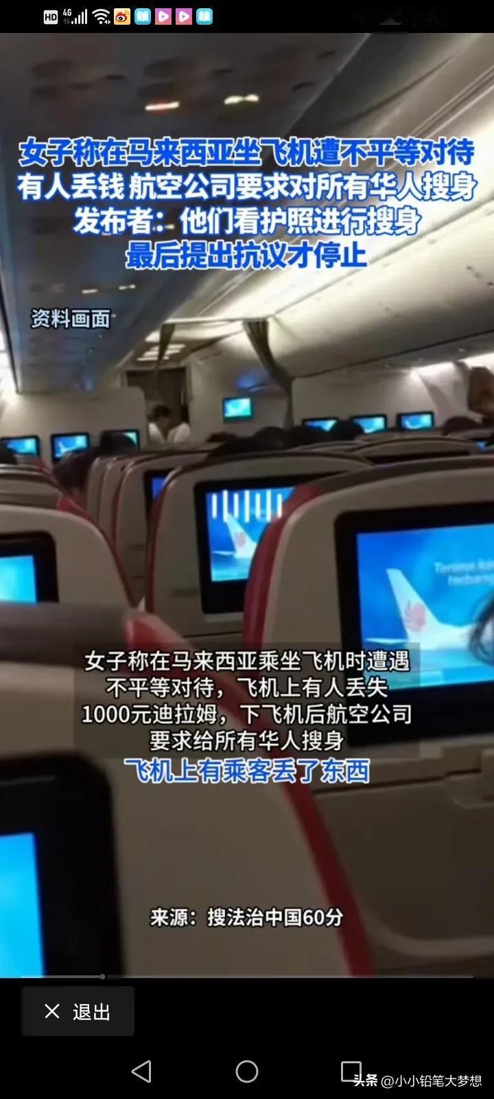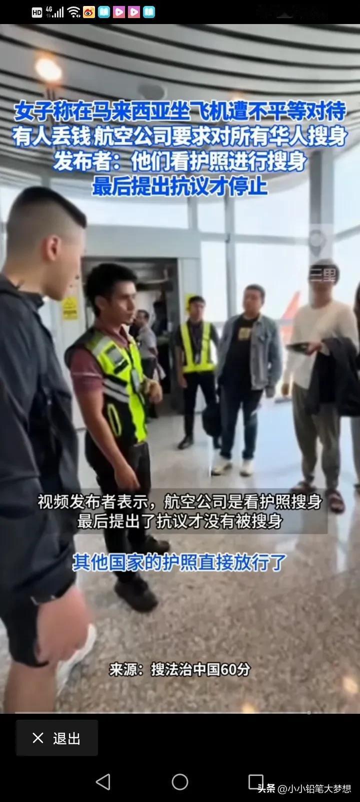 大使馆出来说两句吧!4月9号,一名中国人吐槽在马来西亚坐飞机的时候遇到了不平等对待,飞机上有人丢了东西,只要是中国人都要留下来收身,其他国籍的全部放行。 这名女子说,飞机上有人丢了1000迪拉姆现金,折合人民币大概不到2000块钱,所以在飞下飞机的时候,工作人员要求每个乘客出示护照,只要是中国人的都要扣下来搜身和排查,护照是别的国籍的都可以立马放行。 最后,他们提出抗议之后,才停止了这样的行为,如果是全部人都一视同仁,都盘查和搜身,她觉得无所谓,但是这样子单独对中国人进行搜身,她觉得被侮辱了! #评论区表情包大赛#