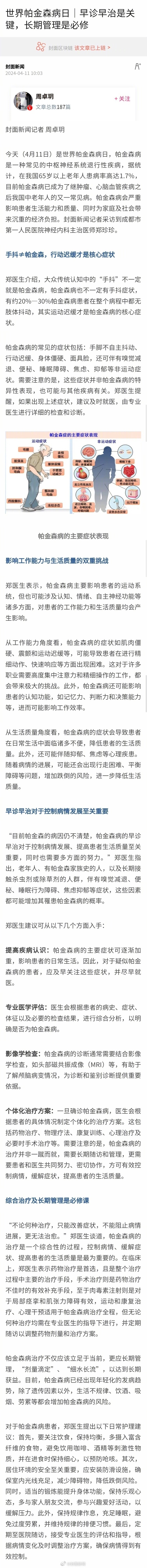 【#手抖不等于得帕金森#[话筒]】今天,是世界帕金森病日。成都市第一人民医院神经内科主治医师郑珍珍介绍,大众传统认知中的“手抖”不一定就是帕金森病,帕金森病也不一定有手抖症状,有约20%—30%帕金森病患者在整个病程中都无肢体抖动,其实运动迟缓才是帕金森病的核心症状。关于帕金森病,还有哪些要注意?戳↓↓
