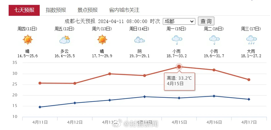 【#成都下周将飙到33℃# 但外套别慌收起来!】最近成都开启艳阳模式,明显感觉热起来啦~本周末成都气温将直冲30℃,下周一(4月15日),成都最高温或将飙到33℃!但别慌把长袖收起来,据成都气象预测,在16-18日成都还有一次明显降温降雨过程,届时日最高气温又将跌回22℃左右。(四川公共天气网、成都气象)