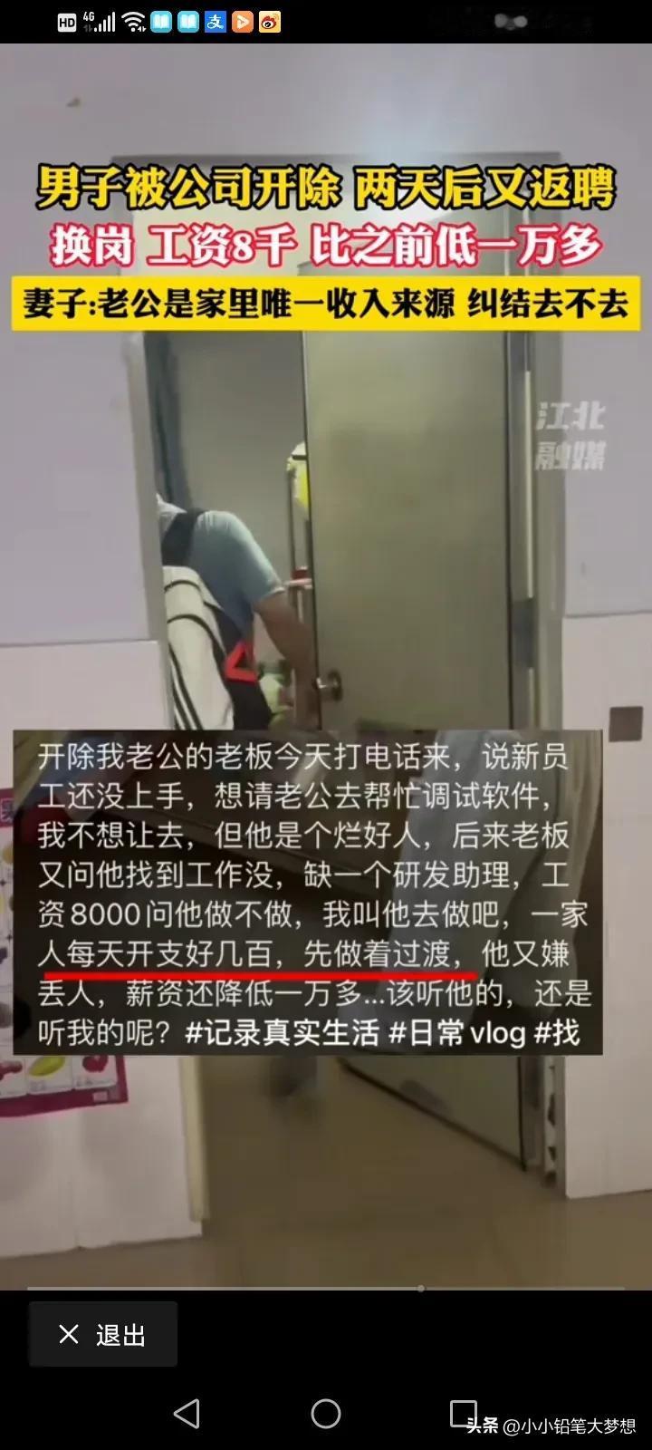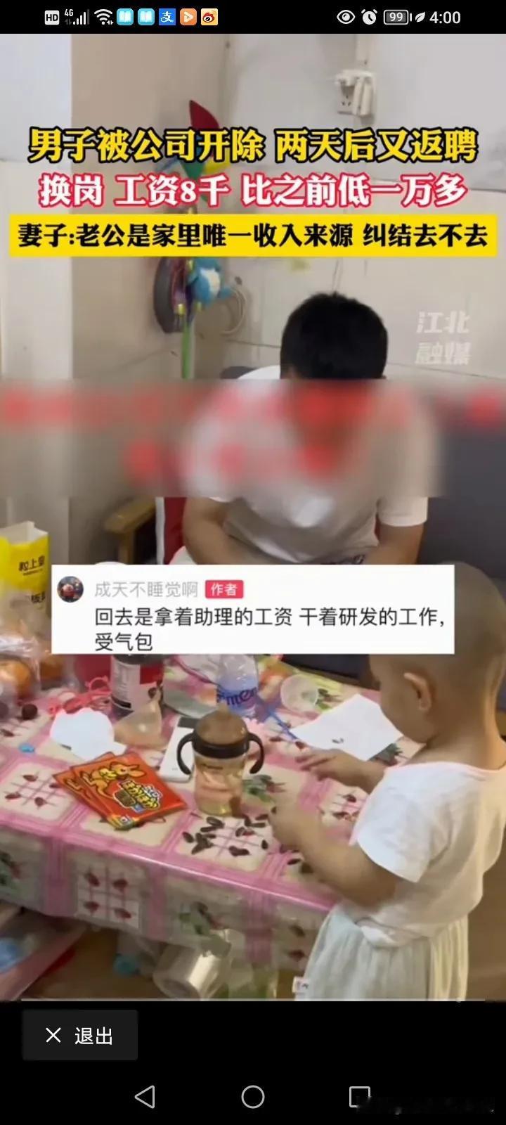 果然,资本家最会拿人软肋,想出这样的招数,真是真损了!近日,一女子纠结发文称自己的老公被公司开除了,两天后公司又给他打电话叫他回去,原因是新请的员工还没有上手,很多活干不来,让他回去帮忙去调试一下软件。 女子称老公是个烂好人,她不想让他去帮忙,结果公司又问他找到工作了没有?说公司还有一个研发助理的位置,可以让他做,但是工资只有8000,比之前少了一万多。 女子跟老公商量说他的工作是家里唯一的收入来源,如果他不去上班,日子很快就熬不下去了,每天的花销好几百,所以他想劝老公回去干,8000就8000。 可是她老公觉得自己被开除的,现在叫他回去干才值8000块钱,觉得太损尊严了,女子还问大家,这种情况该听谁的呢? 看了这个,所谓的返聘,那肯定是新雇过来的那个人干不了这活,证明公司一时半会少不了他,但是他如果真的回去了,那干的活还是原来的一样但是工资却少了一万多,而且还得要教会新人,而且还有可能教会了这个新人之后还会让他在走人,合着好事让资本儿子全占了,这招数太损了,太会算计人了! 这事情你们怎么看?你们怎么选? #评论区表情包大赛# #春日生活打卡季#