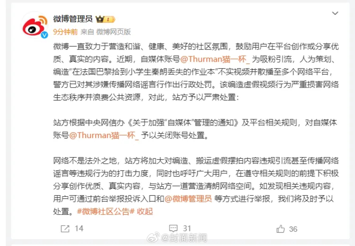 【编造秦朗丢作业事件 网红#猫一杯被全网封号#】近日,警方通报“在巴黎拾到小学生秦朗作业本”视频系编造,公安机关已依法对相关人员作出行政处罚。13日,微博、抖音、视频号等平台对网红猫一杯账号进行全网封禁,平台称鼓励真诚创作,严厉打击编造散播虚假信息、通过恶意摆拍制造或蹭炒热点、故意博眼球占用公共资源等行为。(财经网)