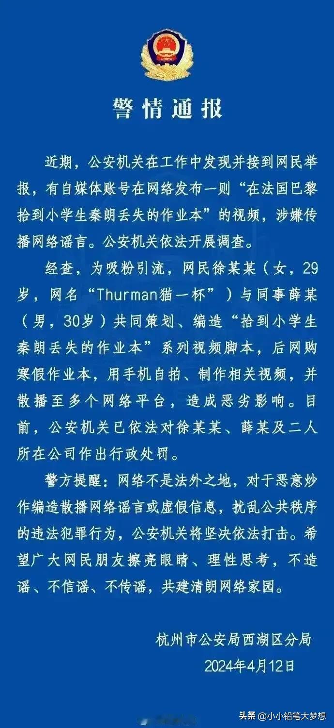 这下《秦朗真的找不到了》!网红猫一杯她真的是万万没想到公安介入!知道公安是怎么确定她是造假的吗?公安做了两件事情,第一是调取了这女网红的淘宝记录,查到有购买同款作业本的网购记录。 第二、警察查了出入境记录,没有秦朗这个人! 没介入前,她还嘴硬,说我根本就没有说是哪家小学?你们不能在评论区自己认啊!这是别人的隐私,不能说不能说! 然后伪造消息聊天记录,改口说我已经联系上秦朗的妈妈了! 很多人说那就当一个段子看,搞笑一下而已,为什么上纲上线了? 网红纵横的时代,那有啥底线啊,连央视都报道了, 影响这么恶劣, 不封以后还会有更多人模仿,误导了大量公众和新闻媒体,消耗了社会资源,所以杀鸡儆猴是正确的! #春日生活打卡季#