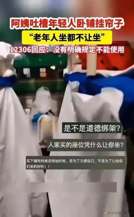 “看看年轻人,列车上还挂这么俩的帘子,让70多岁的老年人连坐都不让坐。”一位大妈拿着手机一边拍摄一边吐槽,这件事情我觉得大妈有点倚老卖老,道德绑架了。 首先,火车上默认70岁的老人可以优先买到下铺,所以如果70岁的老人行动不便,也想方便自己要坐下铺的话,那是完全可以自己买的,上中下铺价格都不一样,下铺是最贵,比如广州到长春的绿皮火车票,正常的情况下要比上铺中铺要贵几十块钱。 而且12306已经明确表示乘客买了票,那么这一趟火车的位置使用权已经归属购票乘客,也就是说,如果买了下铺,我可以拒绝其他乘客坐在我的位置上,这是合法合规的。 而自带帘子,也是为了给自己有一点私密空间,毕竟卫生间的位置太窄,又臭,最主要是经常要排队,想要换一下衣服都特别的难,还有一些带孩子哺乳期的妈妈可以安心喂奶,而12306也明确回应,这属于乘客的私人行为,不会去干涉。 所以下铺并不是默认大家都可以去坐的,只是现在年轻人的边界感特别敏感,但是我觉得如果确实需要借用一下,那可以客气的说一下,我相信大部分的人都不会拒绝,而且换鞋的话确实坐在下铺换比较方便。只要不太过分,大家相互包容,相互理解,都不会拒绝,不让别人坐的。 我觉得坐火车天南地北的人聚在一个车厢里,每一个人都有自己的故事,相互交谈可以学到很多东西,听到很多有趣的经历、见闻还是挺有意思的。 #评论区表情包大赛# #春日生活打卡季#