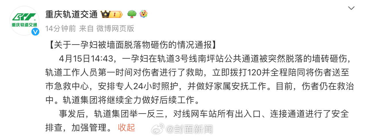 【#重庆被脱落墙砖砸伤孕妇亲属发声#:大人还在重症监护室,胎儿未保住】#重庆被墙砖砸伤孕妇胎儿未保住#4月15日下午,重庆一位孕妇在轻轨3号线南坪站出入口扶梯处,被掉落的多块墙体瓷砖砸中后受伤送医。4月16日,从受伤孕妇张女士亲属处了解到,目前张女士还在重症监护室,未完全脱离危险,而腹中胎儿则遗憾未保住。