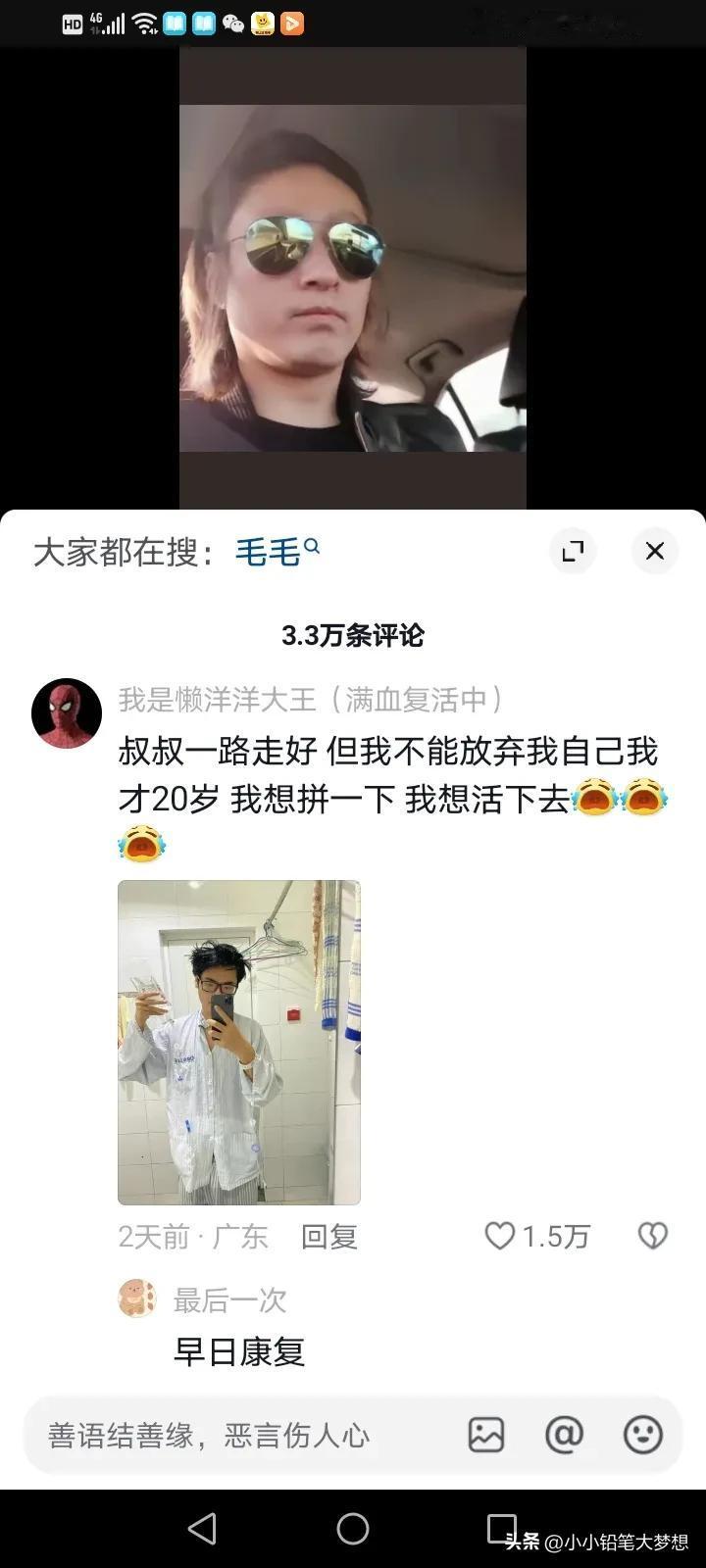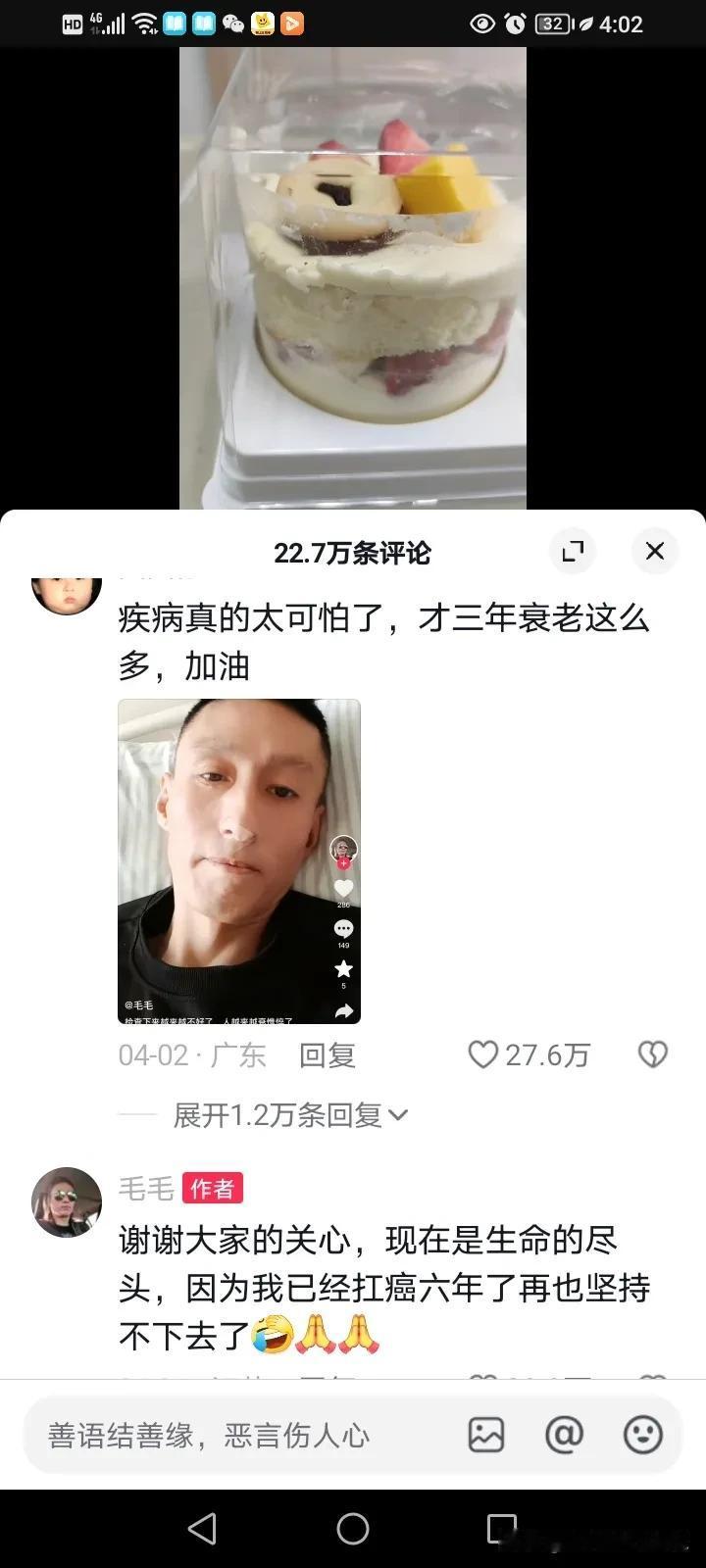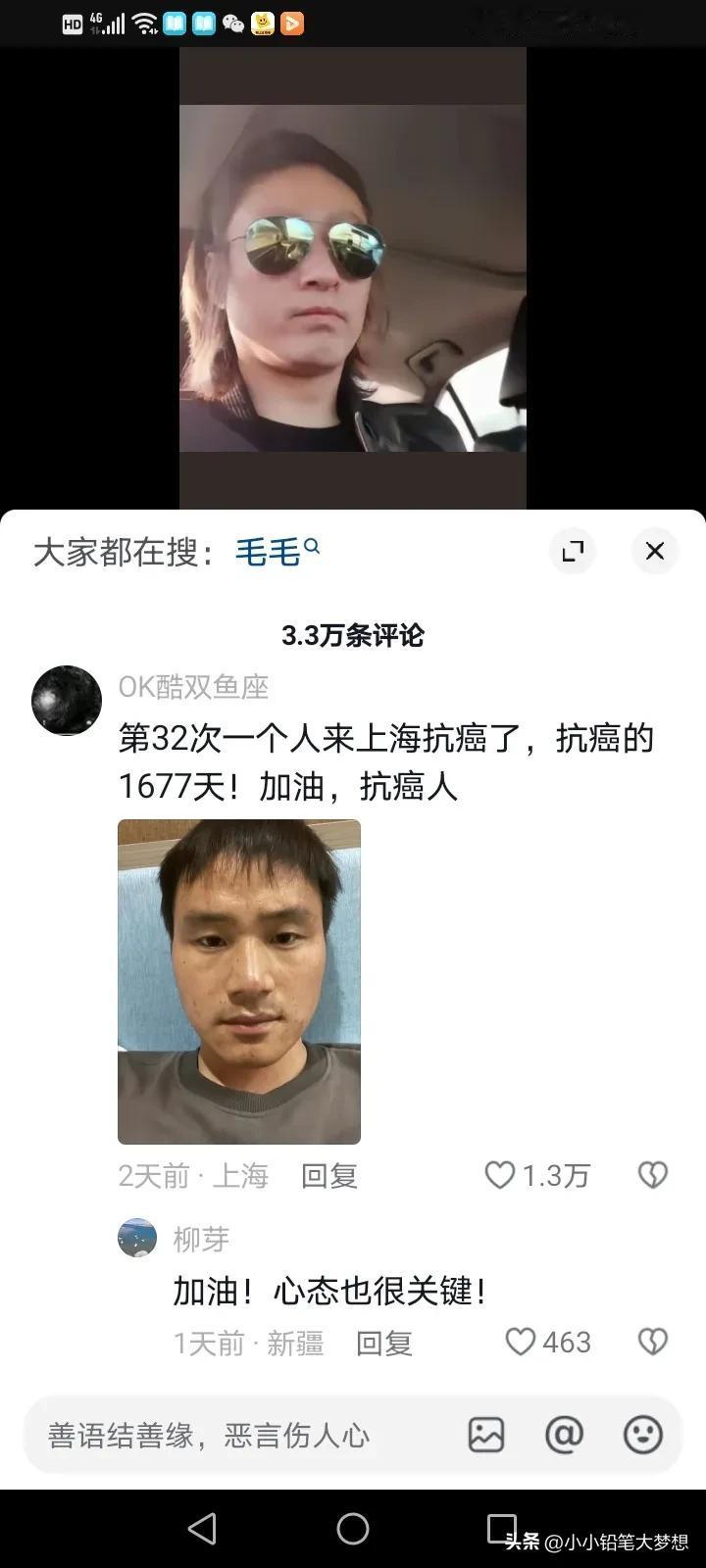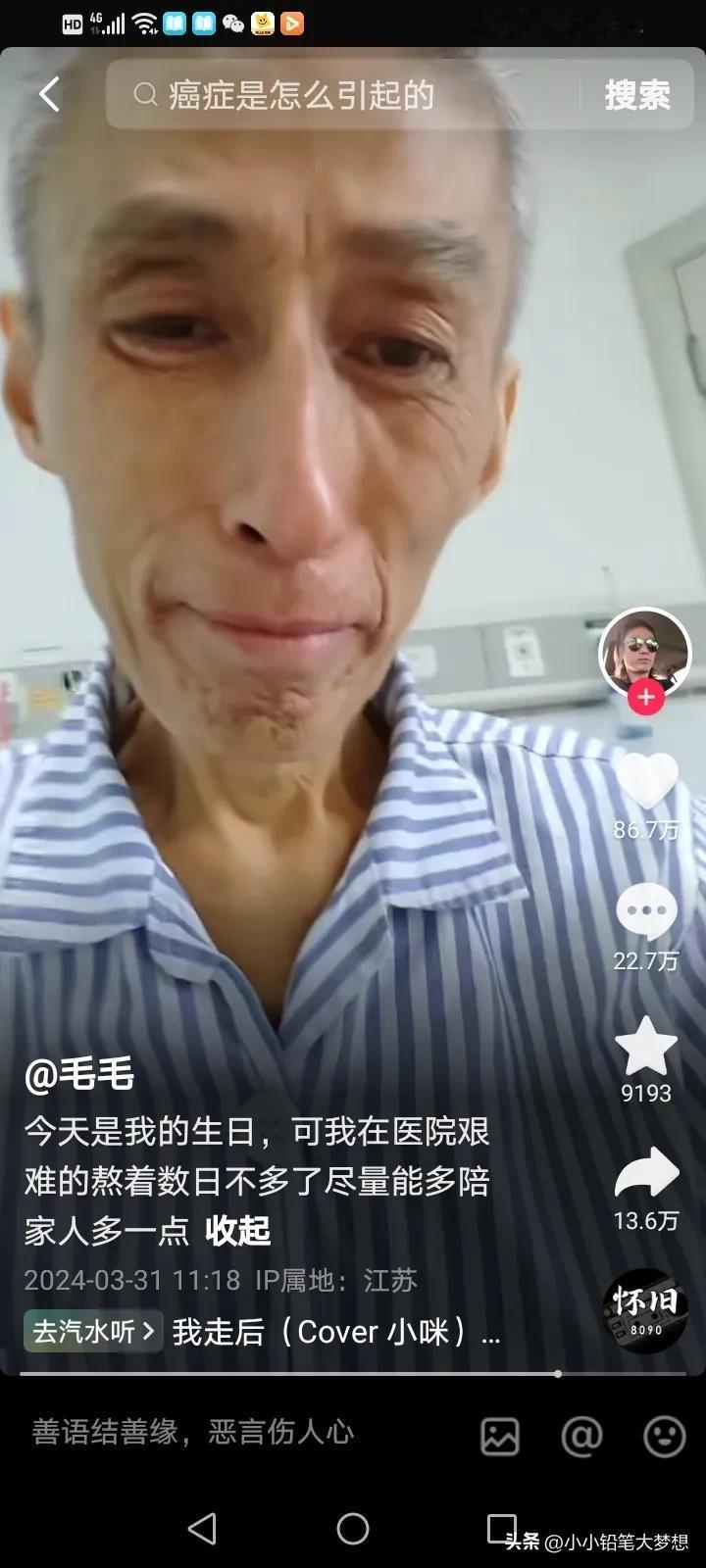 谁能想象这是同一个人呢?一名男子记录自己抗癌后容貌的变化,短短的四年,病魔是有多可怕,从一个年轻的小伙子变成了一个老头,他抗癌整整六年,今年4月14号毛毛的家人在其短视频账号中公布他离世的噩耗,享年47岁。 3月31号,他才刚过了自己47岁的生日,那个时候他看上去还没那么苍老,但是他深知自己的时间并不太多了,他唯一的愿望就是想多一点时间陪伴自己的家人,那个时候他就已经在评论区说了,自己抗癌已经六年了,已经走到了生命的尽头,再也坚持不下去了,评论区里面很多网友都让他继续再加油,不能放弃,因为他曾经说过,坚持再坚持,每天的坚持不是为了感动谁,也不是为了证明给谁看,而是知道一路的奔跑,原比原地踏步好很多。 可是六年的抗癌时间已经磨平了他的坚持了,他慢慢也调整了心态也能坦然接受这一切,他每天都只能靠止痛药熬着,肝区经常疼痛,肿瘤可能又大了,靶向药他已经一年多没有吃了,因为一代仑伐耐药了,而且也没有钱再吃了,只能选择放弃,他原本想要打算出院陪伴家人的,可是自己的身体不争气啊,4月3号,早上刚出院,中午就吐血了,又住进了医院,那是他自己记录最后一条的视频,短短十天,4月14号,他就走了。 我特意去看了一下他的评论区,我真的泪目了,很多网友都在送别毛毛和鼓励自己坚持下去,还有的网友在评论区怀念因癌症去世的家人,让毛毛去找自己的家人玩。 真的感叹,癌症实在太可怕,世界上最珍贵的东西并不是财富,是健康,是关心,是平安。 #春日生活打卡季#