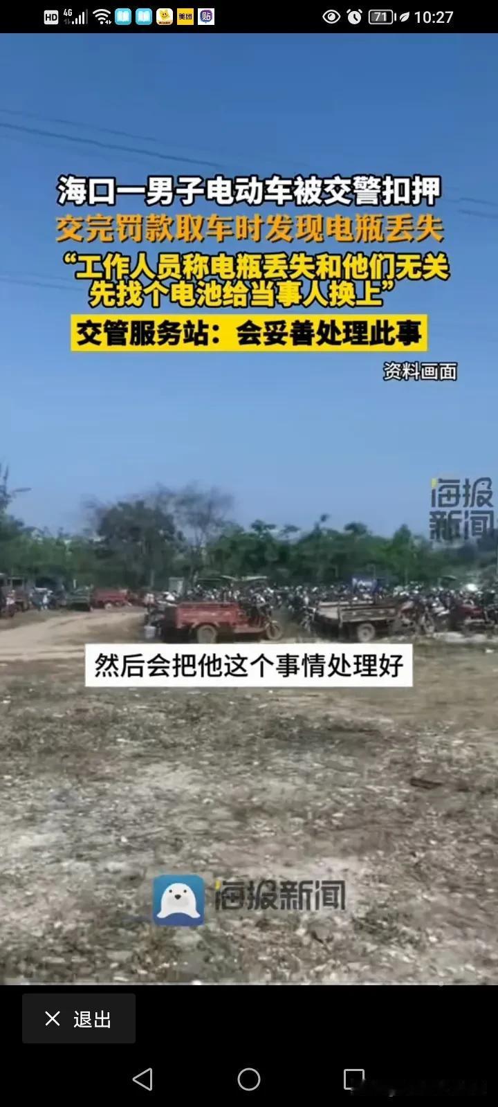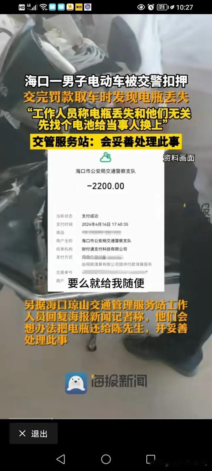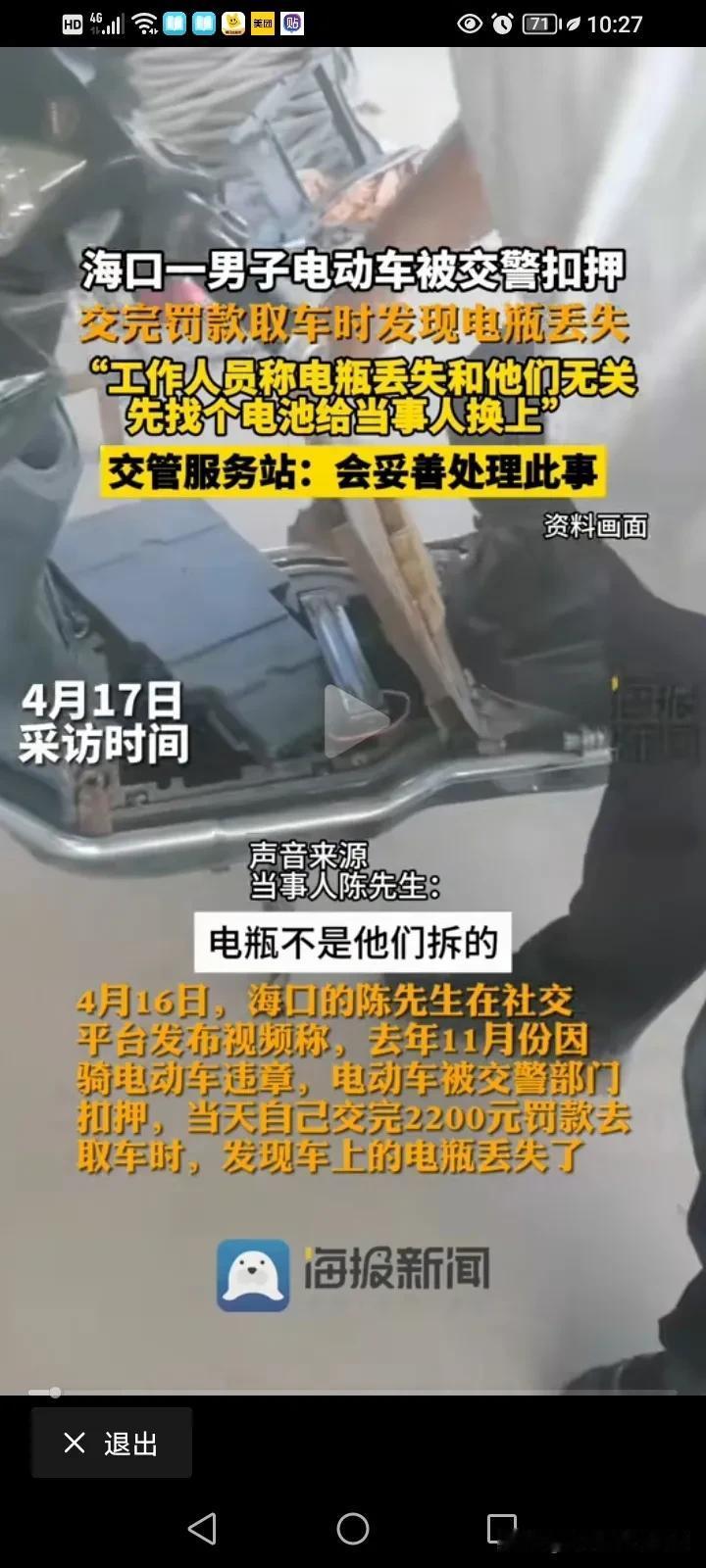 真是天下奇闻,监守自盗还不承认!海口一位男子称,自己的电瓶车被交警暂扣了,他交了2200块的罚款去取车之后发现电瓶不见,工作人员称,你要证明你的车原来是带有电瓶的! 海口的陈先生说,他因为骑电瓶车违章被交警抓了,而且车还被交警部门扣了,当天他就交了2200块钱的罚款,然后去领车,但是拿车的时候才发现自己的电瓶车上的电瓶不见了,他认为自己的车进来的时候好好的,自己交了钱,领车的时候,这个电瓶就不翼而飞了,那肯定是停车场的管理人员出问题了,而且应该对这个事情负责。 可是呢,停车场的管理人员却告诉他,这件事情不关他们的事儿,你怎么证明你的车进来的时候就有电瓶呢? 这就奇葩了,车是你们带走的,然后现在电瓶不见了就不承认了,这个证明要怎么证明呢?那是不是查一下当时的交警执法仪就可以证明了? 这名男子就跟工作人员掰扯起来,这名工作人员说,那我随便找一个电瓶给你安上,你就推走就OK了,这名男子肯定不同意啊,哪有这样敷衍了事的,而且他给的电瓶也不知道是不是合适的。 男子后来就找到了当地的交管部门,这个工作人员又推脱了,这事情你去找我们主任吧,他说这个电池我们肯定想办法还给你的,你放心,我们会进行一个合理的解决!肯定想办法还给你,那是不是当地交管部门已经知道这个电瓶的去向了? 这下就莫名其妙了,这电瓶是被别人偷了,还是被别人卖了?是不是进来的车都是这样操作呢? 这个管理的工作人员当时说随便找一个给你安上,那是不是平常被发现也是这么做处理的呢?他还冤枉的说这事与自己无关,你负责管理这里,出了事你却说与你无关?这事说的过去不?那这个电瓶车的电瓶到底是谁偷的呢? #春日生活打卡季##评论区表情包大赛#