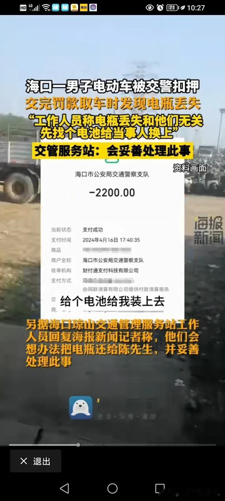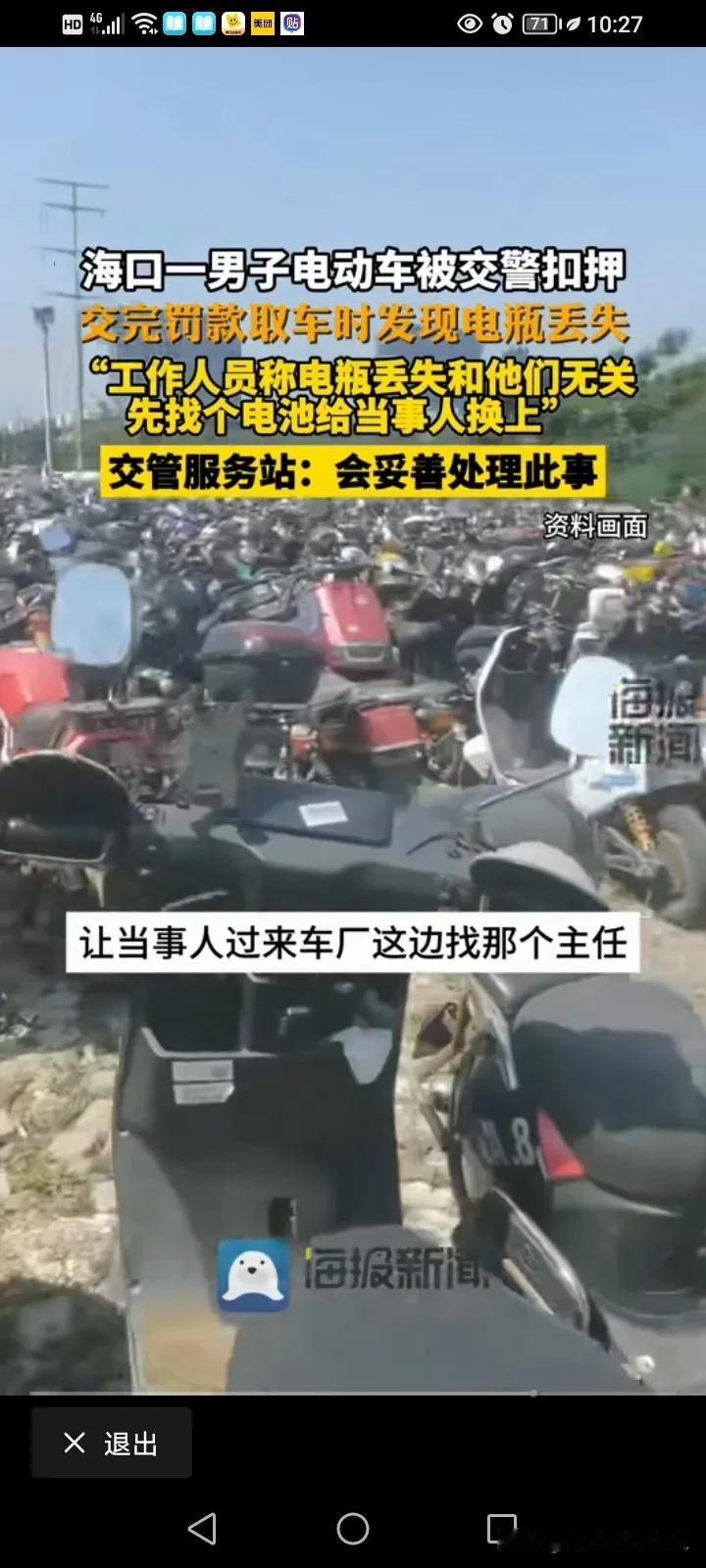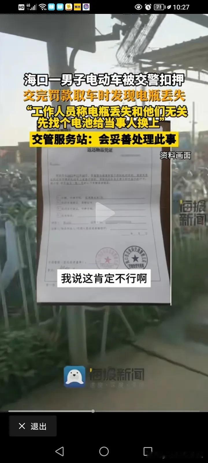 真是天下奇闻,监守自盗还不承认!海口一位男子称,自己的电瓶车被交警暂扣了,他交了2200块的罚款去取车之后发现电瓶不见,工作人员称,你要证明你的车原来是带有电瓶的! 海口的陈先生说,他因为骑电瓶车违章被交警抓了,而且车还被交警部门扣了,当天他就交了2200块钱的罚款,然后去领车,但是拿车的时候才发现自己的电瓶车上的电瓶不见了,他认为自己的车进来的时候好好的,自己交了钱,领车的时候,这个电瓶就不翼而飞了,那肯定是停车场的管理人员出问题了,而且应该对这个事情负责。 可是呢,停车场的管理人员却告诉他,这件事情不关他们的事儿,你怎么证明你的车进来的时候就有电瓶呢? 这就奇葩了,车是你们带走的,然后现在电瓶不见了就不承认了,这个证明要怎么证明呢?那是不是查一下当时的交警执法仪就可以证明了? 这名男子就跟工作人员掰扯起来,这名工作人员说,那我随便找一个电瓶给你安上,你就推走就OK了,这名男子肯定不同意啊,哪有这样敷衍了事的,而且他给的电瓶也不知道是不是合适的。 男子后来就找到了当地的交管部门,这个工作人员又推脱了,这事情你去找我们主任吧,他说这个电池我们肯定想办法还给你的,你放心,我们会进行一个合理的解决!肯定想办法还给你,那是不是当地交管部门已经知道这个电瓶的去向了? 这下就莫名其妙了,这电瓶是被别人偷了,还是被别人卖了?是不是进来的车都是这样操作呢? 这个管理的工作人员当时说随便找一个给你安上,那是不是平常被发现也是这么做处理的呢?他还冤枉的说这事与自己无关,你负责管理这里,出了事你却说与你无关?这事说的过去不?那这个电瓶车的电瓶到底是谁偷的呢? #春日生活打卡季##评论区表情包大赛#