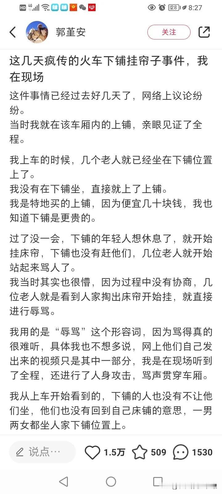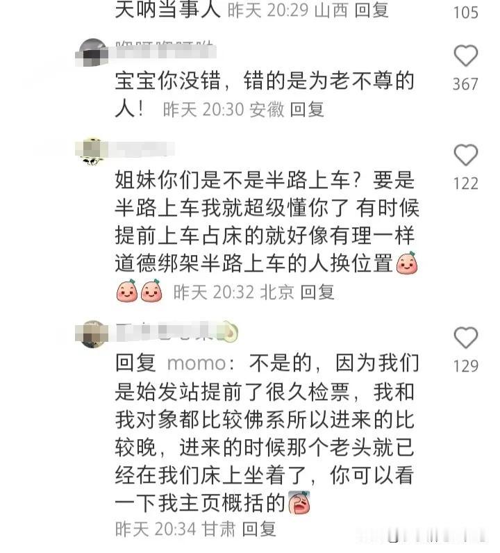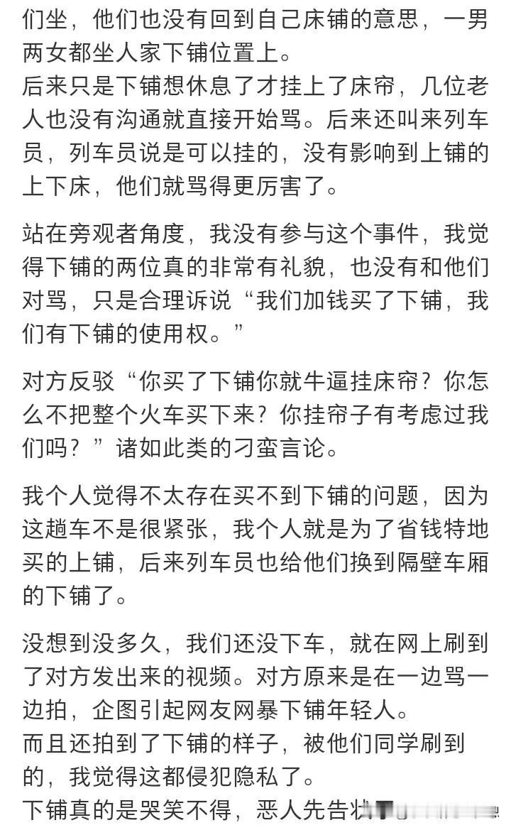 火车下铺挂帘的当事人回应了,而最上辅的一位小姐姐也同样发声了!这三个老人真的不是一般的坏!恶人先告状,全程就没有跟人好好沟通,还倚老卖老道德绑架! 当事人发声说,他们上火车的时候,老人已经坐在他们床上了,当时走廊上的椅子还是空着的,因为要收拾东西,所以跟他们说了一声让一下,然后他们又坐到对面他对象的卧铺一直不走,后来他们挂帘子要准备休息,这两个老人就开始大骂,还找来了列车员评理。 结果人家列车员都说不影响,他们还继续骂。 而上铺的姐姐也看不过去,发声了,几个老人人身攻击,骂声贯穿了整个车厢,他觉得下铺的两个年轻人太冤了,所以最决定出来澄清整个事情。 #春日生活打卡季# #评论区表情包大赛#