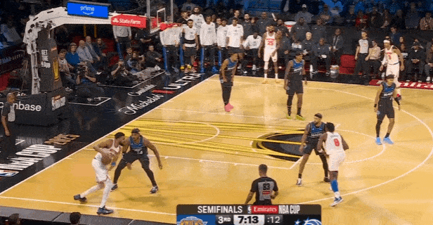 大乔突破迂回后传给外线接应的唐斯,唐斯接球三分线外一步直接出手速射三分。