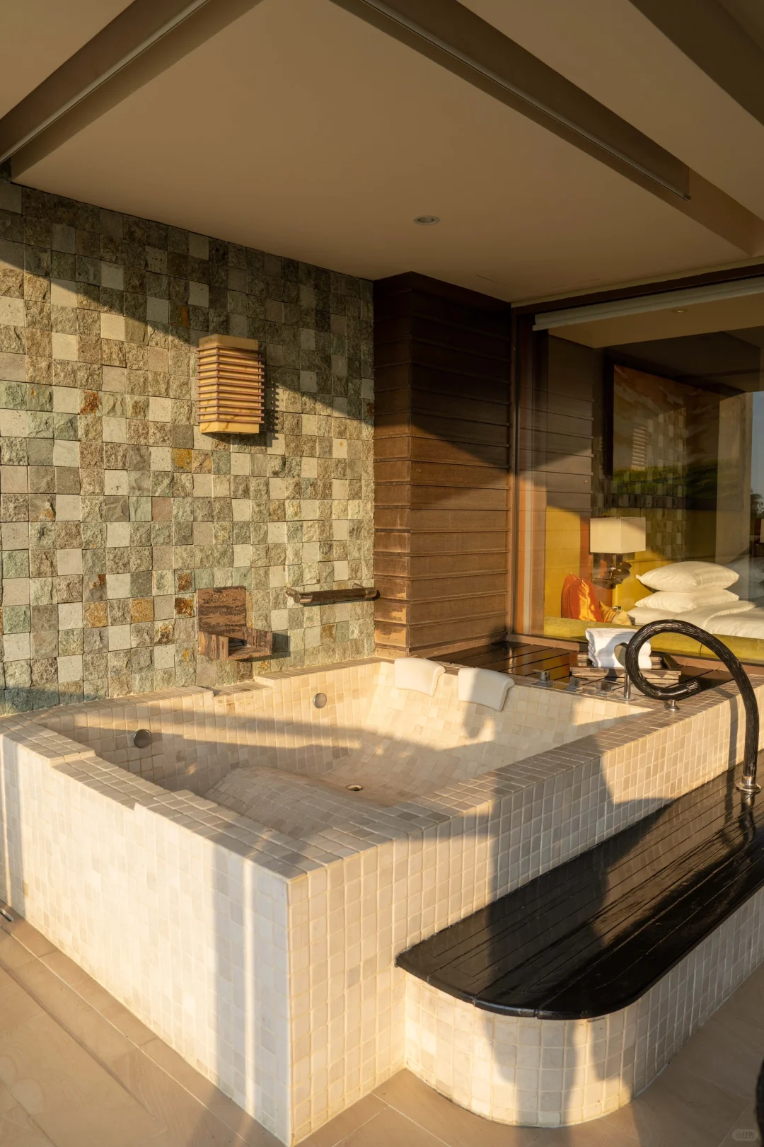 阳台面积很大,户外有超大的双人浴缸,晚上泡在温水里,听着海浪声,蛮有度假氛围感的。