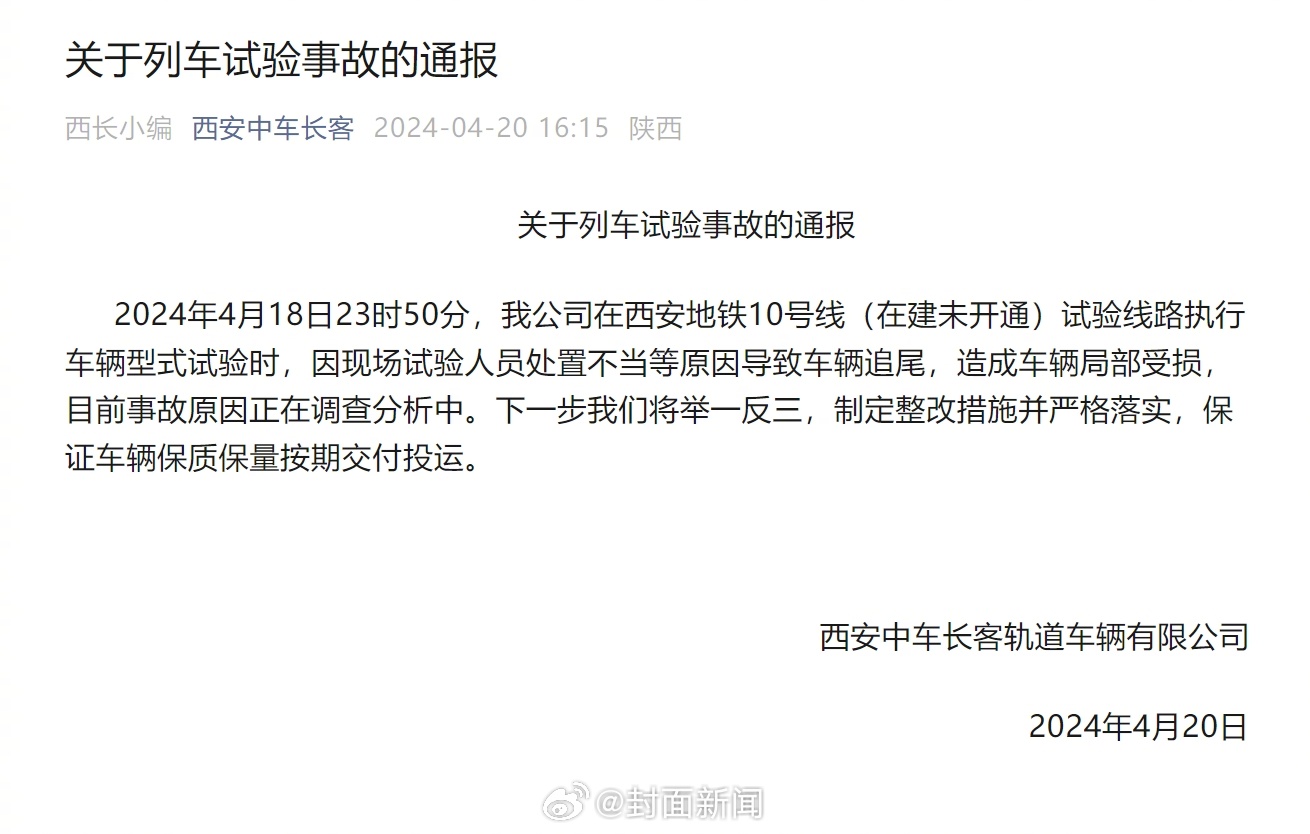 【#官方通报西安地铁试车事故#:因试验人员处置不当导致追尾】4月20日,西安中车长客发布通报:4月18日23时50分,我公司在西安地铁10号线(在建未开通)试验线路执行车辆型式试验时,因现场试验人员处置不当等原因导致车辆追尾,造成车辆局部受损,目前事故原因正在调查分析中。下一步我们将举一反三,制定整改措施并严格落实,保证车辆保质保量按期交付投运。#西安地铁10号线试车时发生事故#