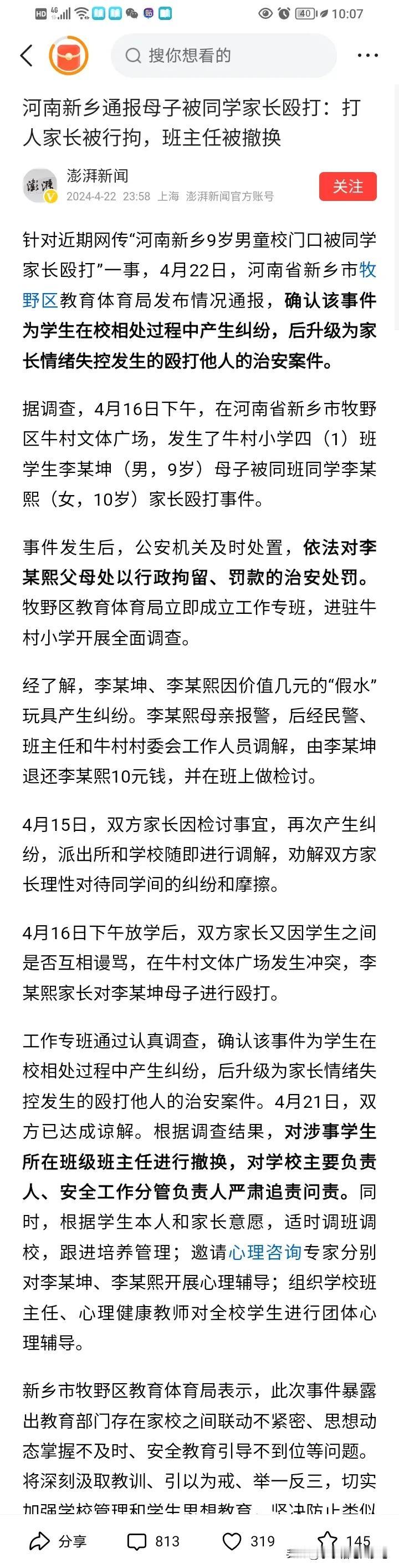 河南新乡9岁男孩被打,官方通报已经出,班主任被撤,很多人说最终还是班主任扛下了所有,但根据女孩的家属发文所说这班主任就活该! 9岁男孩被打,男孩和男孩的母亲都被打进医院,而女孩的父亲也因此被拘留了,男孩的母亲发视频说,孩子之间无论是什么矛盾,都不应该由家长插手! 但是看到女孩家属发的长文,这男孩的一家也真的太可恶了,这校长和班主任真的是不作为! 第一次派出所调解,校长的电话就打不通,最后两个家庭是在社区和警察的监督下签下了和解协议,协议的要求是归还之前勒索的钱财,然后男孩要当着同学的面给女孩道歉,而男孩的家长也保证以后不会再发生这样的事情! 可没想到的是,男孩不单只没有给女孩道歉,还变本加厉的威胁女孩,还嚣张的说出:“要是再敢告诉你的家人,我还会继续打你,有种叫你爸下午来!” 而这个班主任也被这名男孩告到警察局,班主任就是因为这件事情选择了妥协,睁一只眼闭一只眼,家长要求分班,他也没当回事! 而男孩的家长真的嚣张啊,在面对民警的情况下,他们还大放厥词:“我们教育局里有人!” 而男孩的爷爷也是护犊子的,还教这名男孩怎么去欺负女同学?而女孩的爸爸被拘之后,家属要求调解,而这位爷爷却当着警察的面说:“想要和解?先给20万!” 熊孩子的背后肯定是有熊家长的,孩子一直在家里,被惯着,在学校里面嚣张跋扈,学校没有办法,老师被拿捏,因为是未成年人,警察和稀泥,孩子的爸爸走了正规的渠道却起不了任何的效果,这是逼到走绝路了,但是以暴制暴的行为真的是对的吗? 这绝对是不对的,因为这是犯法的行为,必须要受到法律的惩罚! 但是如果你是孩子的家长,遇到这种事情你又会是怎么做呢? #春日生活打卡季#