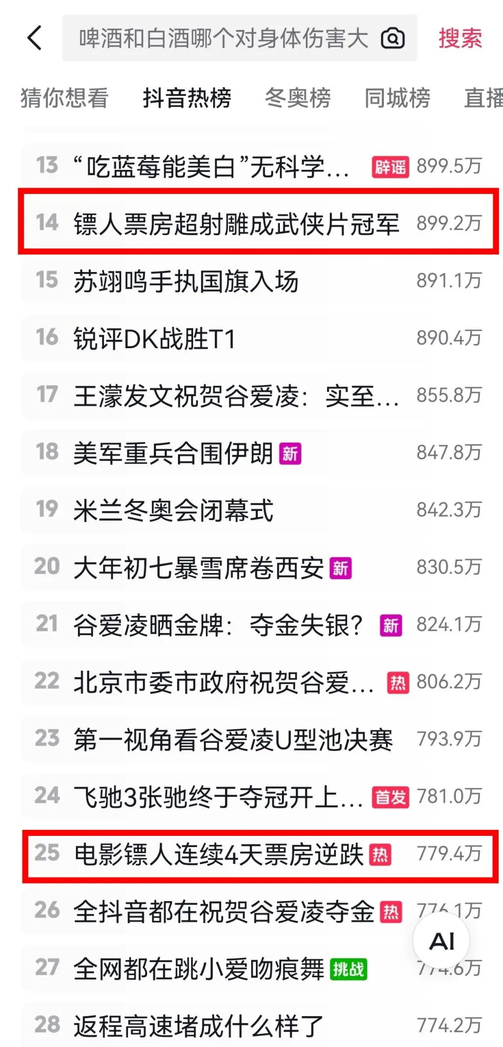 同时,抖音话题 #镖人话题超射雕成武侠片冠军# 热度达到899.2万,#电影镖人连续4天票房逆跌# 热度飙升至779.4万,网友自发转发观影感受、呼吁增加排片,形成了“口碑带动观影,观影反哺口碑”的良性循环。数据印证了这份逆袭的力度:2月19日大年初三,《镖人》单日票房达11176.5万元,超过前一日的9860.4万元,成为春节档唯一实现逆跌的新片,截至2月24日0时,累计票房已达8.06亿,并逐渐缩小与排名第二的《惊蛰无声》票房差距。