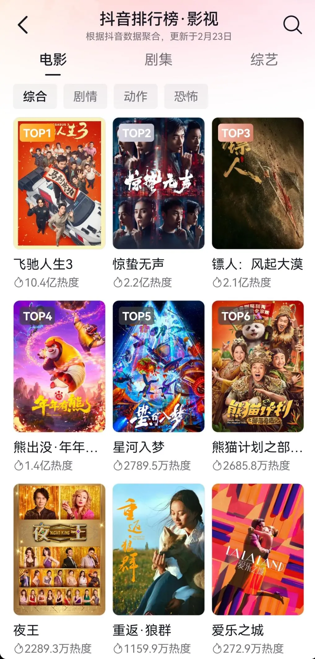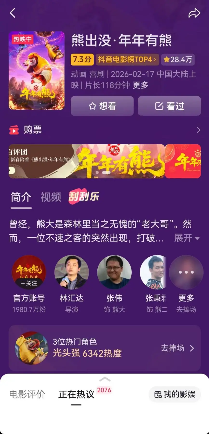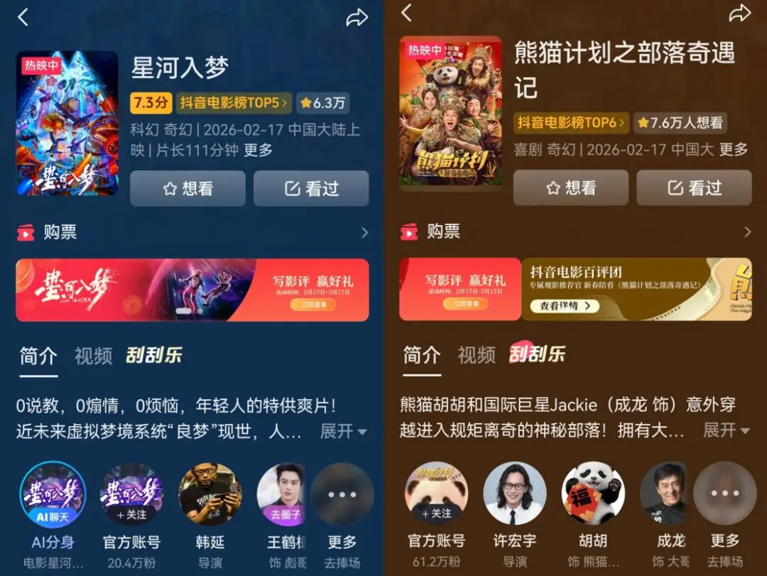 值得注意的是,《镖人》的逆跌,并非个例,而是今年春节档“口碑至上”逻辑的集中体现。其中,抖音电影评分则成为这场口碑传播的“放大器”。除了《镖人》,抖音影视榜中排名第四至第六的影片,也凭借稳定的口碑,展现出强劲的长线发力潜力:《熊出没·年年有熊》抖音评分7.3分,依托亲子观影群体的稳定需求,票房稳步攀升至7.14亿,成为春节档最稳健的“黑马”之一;《熊猫计划之部落奇遇记》《星河入梦》虽前期票房表现平平,但凭借抖音平台的口碑沉淀,逐步吸引目标受众,截至目前分别斩获1.93亿、8057.96万票房,并未被头部影片彻底挤压生存空间。