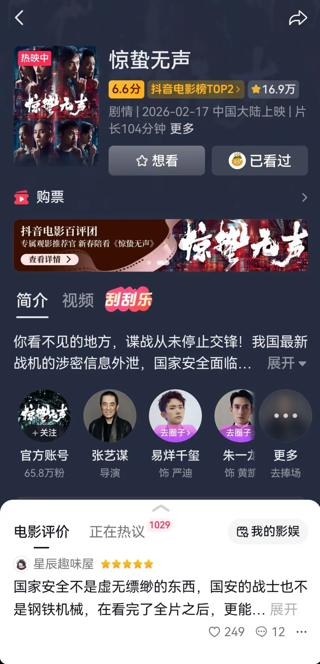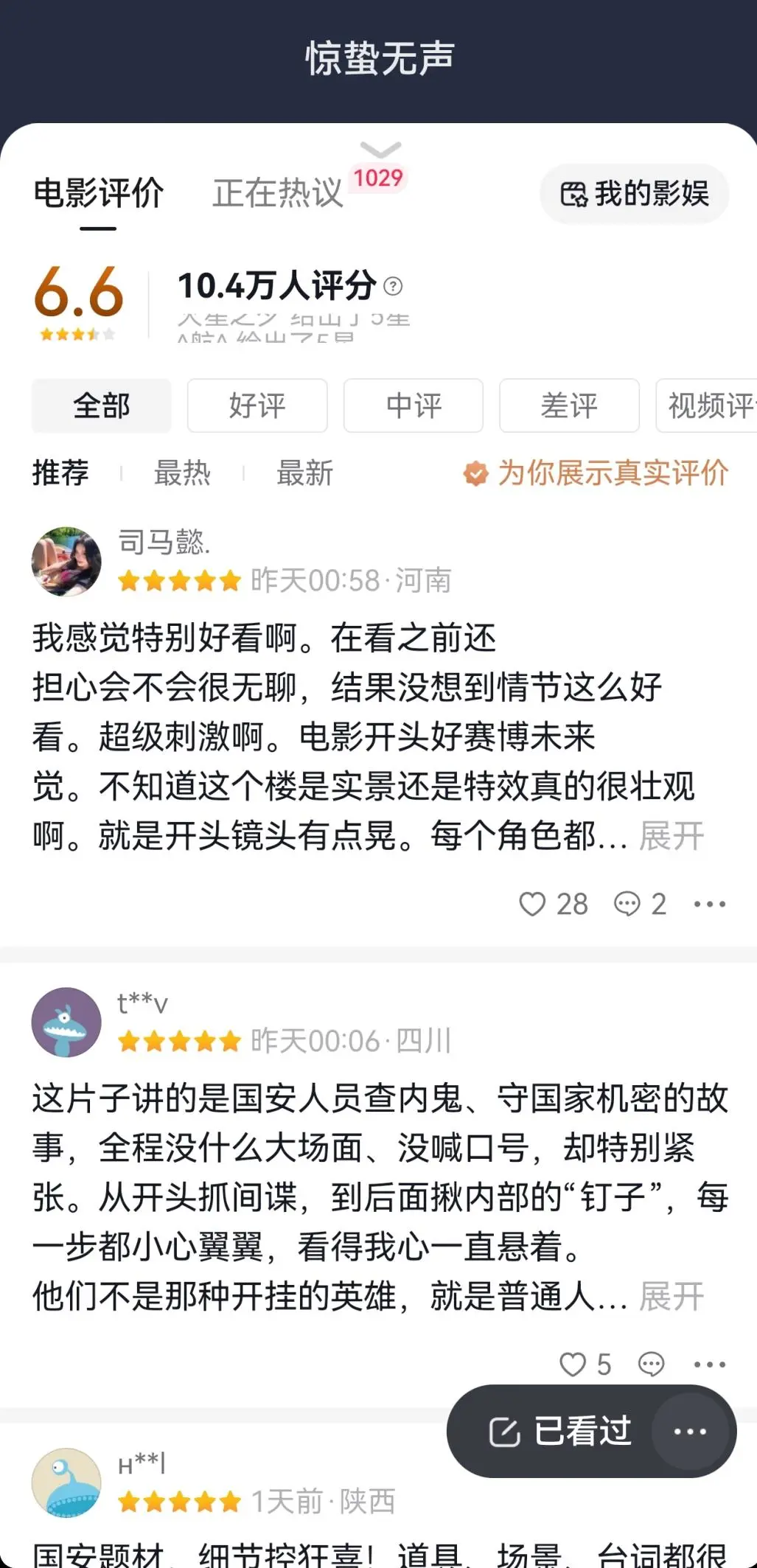 《惊蛰无声》以6.6分、10.4万人参与评价位居其后,中规中矩的口碑使其票房表现不及预期,网友评论客观中肯:“题材很有意义,无人机镜头很新颖,演员演技在线,但节奏偏缓,适合静下心来慢慢看”“作为谍战片爱好者,觉得视角很新颖,贴合当下语境,就是部分剧情铺垫有点拖沓,整体值得一看”。