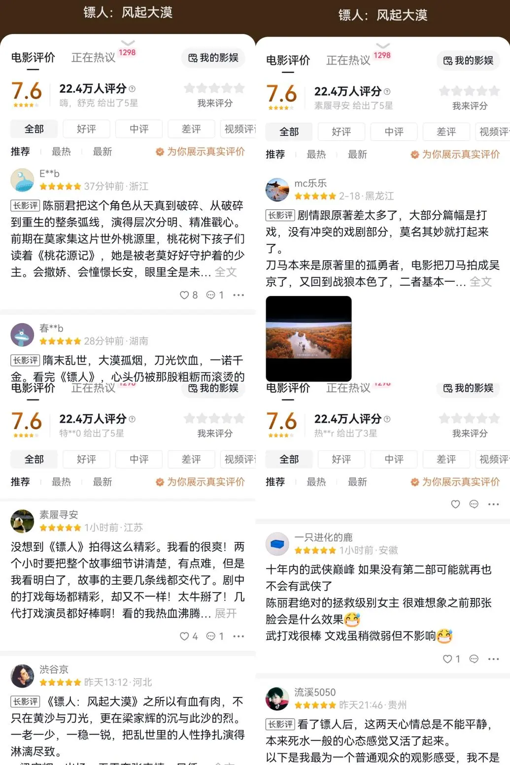 上映后,第一批走进影院的观众、武侠迷纷纷在抖音电影评分区留下真实反馈,有人写道:“没有花里胡哨的特效,拳拳到肉的打戏太震撼,实景大漠把江湖气拉满,抖音刷到片段就果断冲了,果然没失望”;也有原著粉留言:“还原度拉满,刀马的侠义、大漠的苍凉都拍出来了,一开始排片太少差点错过,刷抖音看到评分7.6分,特意找影院二刷”;还有观众感慨:“没想到有生之年还能看到李连杰、吴京、张晋三位对打,中式武侠终于回来了,抖音上刷到倒立打戏片段,立马带家人去看”。