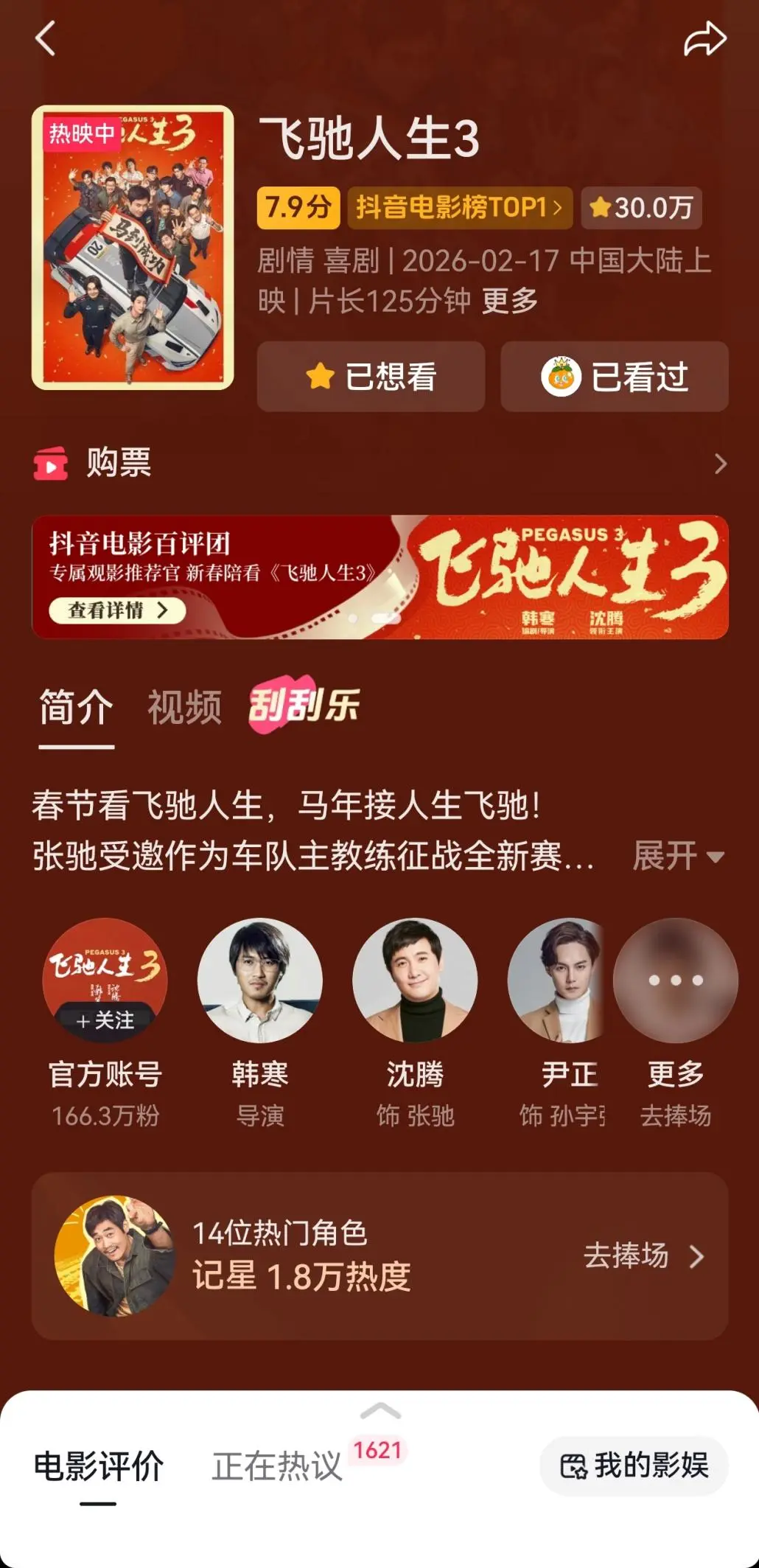 截至影片上映7天,抖音影视榜已清晰呈现出今年春节档的口碑梯度:《飞驰人生3》以7.9分、47.4万人参与评价的成绩稳稳占据榜首,话题#飞驰人生3口碑也是油门加满#热度高达798.4万,#沈腾飞驰人生3冠军车原型# 热度高达801.4万,诸多话题都让电影延续了系列IP的国民度优势,网友评论尽显认可:“本来是陪孩子来看沈腾的,没想到被赛车戏份燃到起鸡皮疙瘩,没有多余煽情,只有热爱与坚守,春节档最值的观影体验”“作为赛车迷必须夸,细节还原太到位,后半段的赛场名场面,音效和镜头感直接拉满,沈腾这次彻底跳出喜剧圈了”;