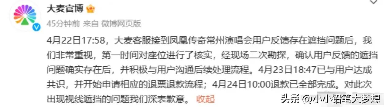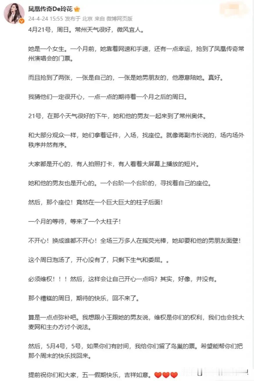 这就是格局!为凤凰传奇点赞!凤凰传奇常州站,一个女生一个月前抢了两张演唱会票,满怀开心的去看的时候,结果发现自己的面前有一条大柱子,完全遮挡了视线!所以整场演唱会给他们带来了不好的体验。 其实这件事情真的跟歌手没有关系,完全是场地售票商的问题,因为一般遮挡视线的座位票都不会安排售卖的。 后来玲花为了弥补买了这种遮挡视线票的粉丝遗憾,然后为他们都预留了鸟巢门票,“希望能帮你们把那个周末的快乐找回来”。 而当事人也发声了 ,她说真的很感动,玲花写的这篇文章她读了不下十遍,完全描述了她当时的心理历程,还说这件事情本来就不关艺人的事,但玲花姐还为粉丝发声,她真的觉得好感动,凤凰传奇的团队已经联系她了,她选择四号去北京看演唱会,而且玲花姐为他们预留的位置非常好,是内场的第三排,当天遇到同样情况的小伙伴,维权也成功了,也是同样得到了赠票的待遇。 #春日生活打卡季#