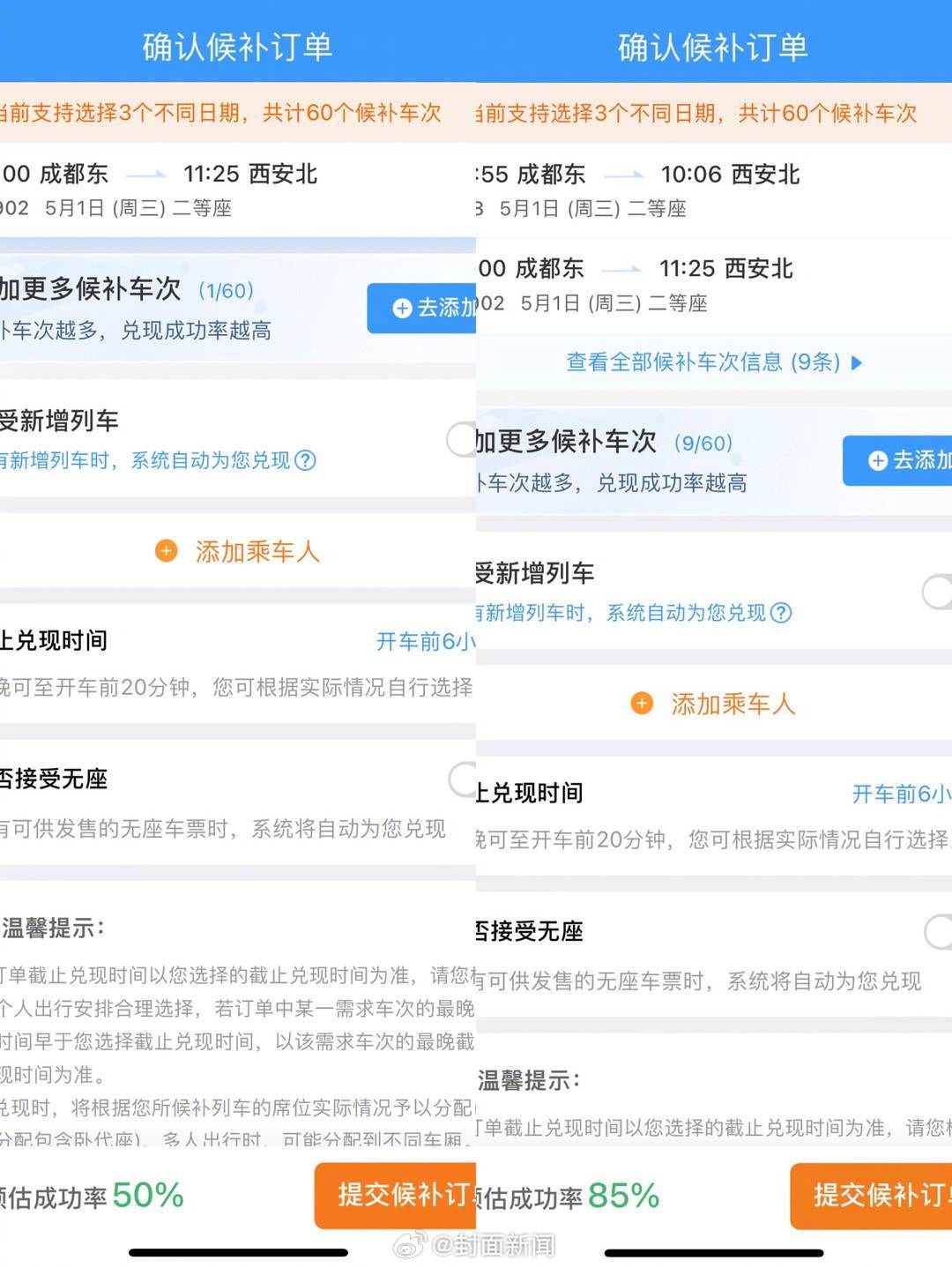 【#12306否认公众号留言能成功求票#:没用】近日,多位网友发帖称,向“12306”微信公众号留言求票,就能够增加车票候补成功率。对此,12306客服回复:“没有这个说法,系统会根据候补订单的下单顺序排单,传言纯属巧合。”如何提高车票候补成功率?记者亲测发现,#多选车次可提高候补成功率#。以成都东到西安北的候补订单为例,选择1趟车的成功率为50%,选择9趟车的成功率就会提升到85%。