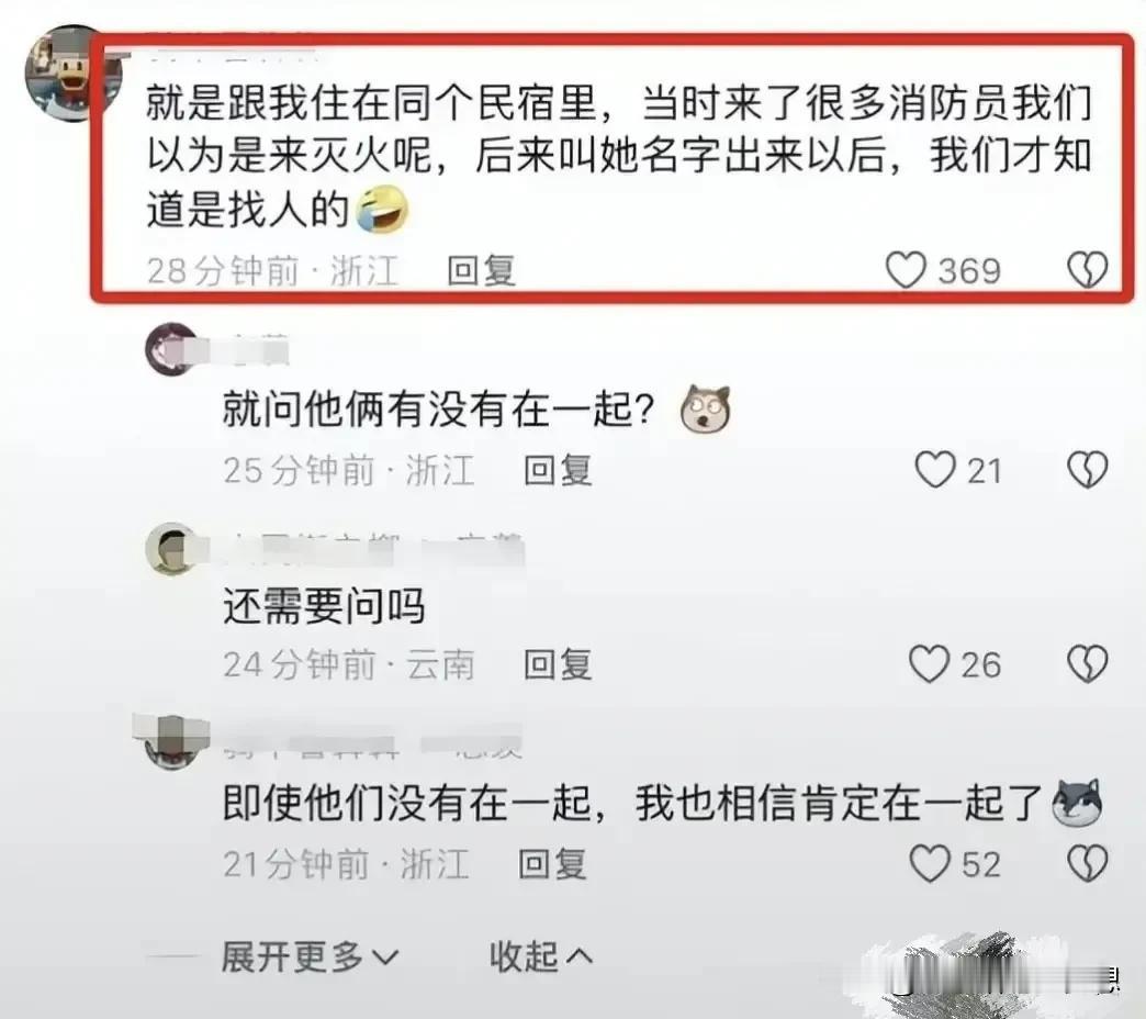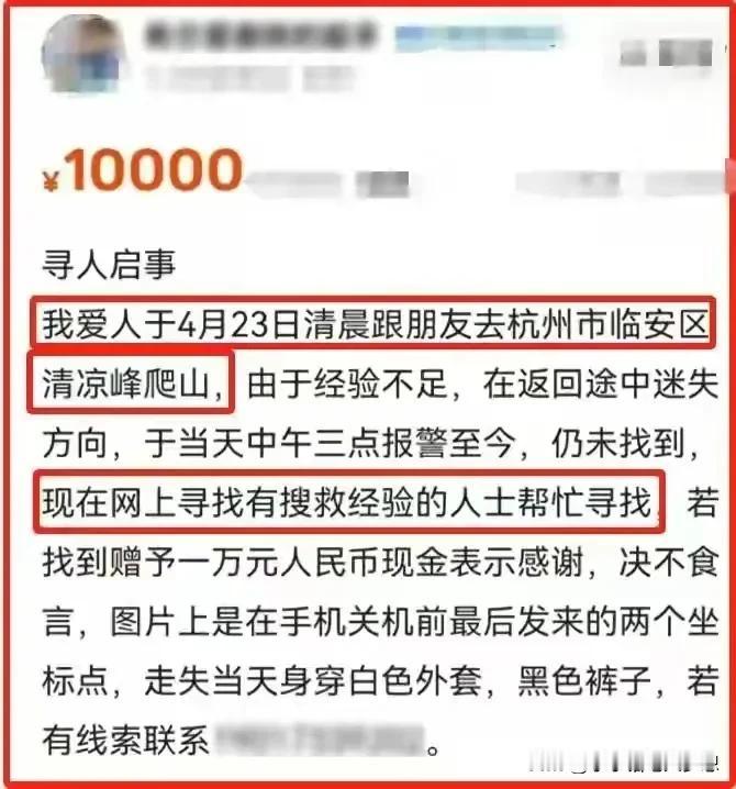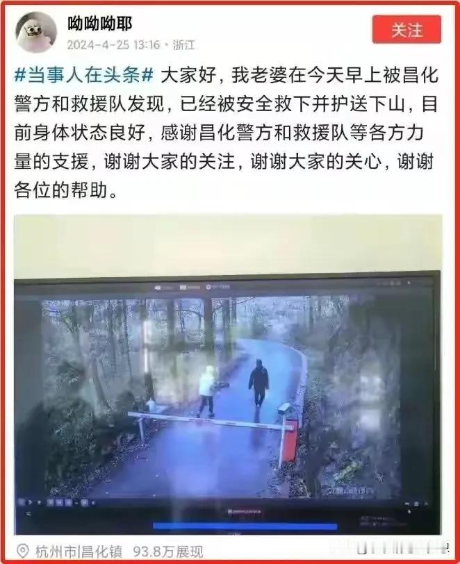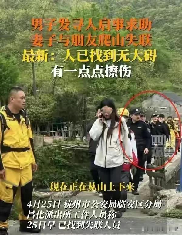 妻子和异性男子爬山,完整的事情经过来了已经理清楚了!23号一大早26岁的妻子和刚认识的男子出发去爬临安清凉山,两人并没有携带登山包、登山杖和帐篷等等登山设备。 23号下午,妻子的手机关机,丈夫连续多次都是失联的状态,男子就发帖求助,并悬赏一万,但是无果,最后选择了报警。 24号,消防救援队进山搜救,清凉山工作人员怀疑他们走进了核心区,结果这两人在山里待了两天两夜,25号清晨,被救援队发现。 丈夫说自己的妻子并没有大碍,只是有一点点擦伤,而男子也不是没有受伤,他的腿都流血了,也包扎了,而且他还晒出了一个图片。 两人是因为没有做好充分的准备,导致两人下午三点钟的时候手机不约而同的没有电了,至于有朋友说看见他们在客栈里面,他说这是谣言,不可信,大家不要恶意猜测。 #春日生活打卡季#