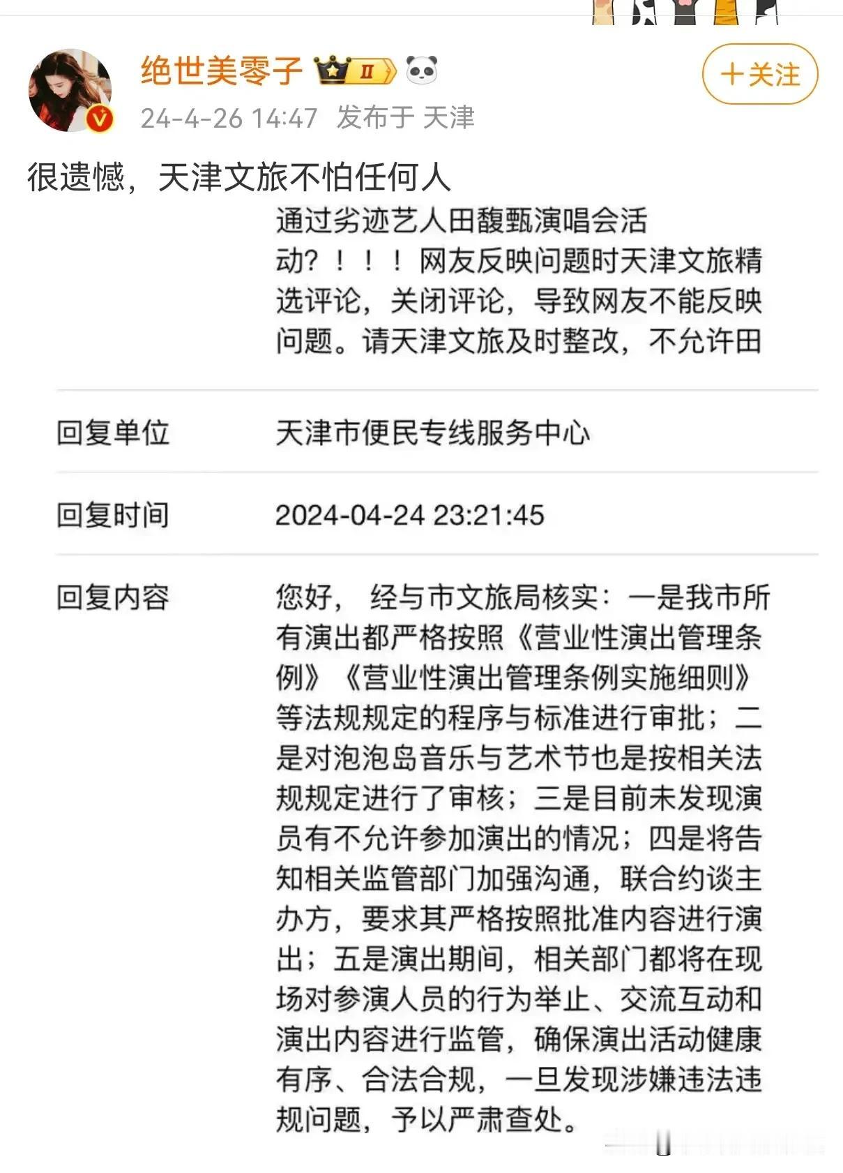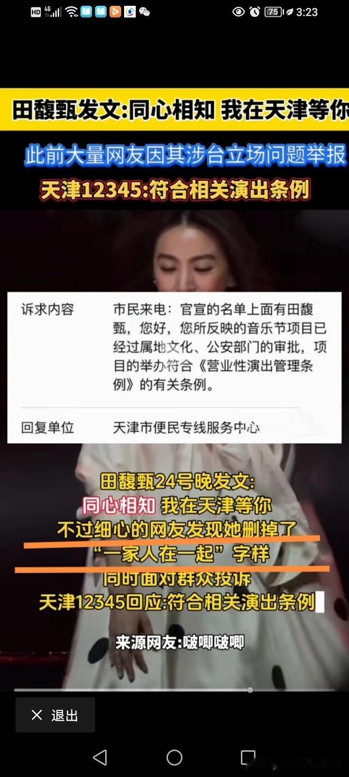 某女歌手要来天津音乐节演出,这事引起轩然大波,本来我不想说的,但我看到某女居然厚着脸皮回应“在天津等你”,这事我就不懂了,我想问天津文旅,还把这样的人放在压轴表演,没了这个女歌手,这个音乐节真的是办不来了吗? 12345都被打爆了,那些接线员应该都被打烦,只能机械的回应什么符合流程。 她经常在关键的立场发表那样的言论,而且这一次还把“一家人在一起”绝对是故意的,这个事情还真不是小事情,涉及到大是大非的问题,中国那么多优秀的艺人,难道找不到一个替代的? 这种端起饭来吃,扔下碗我骂娘的人,我们还要给她机会吗? 天津文旅,你们还是醒醒吧,不要因为这样一个人坏自己的名声,应该以祖国统一大局为前提,对于T独分子坚决拒之门外。 #春日生活打卡季#