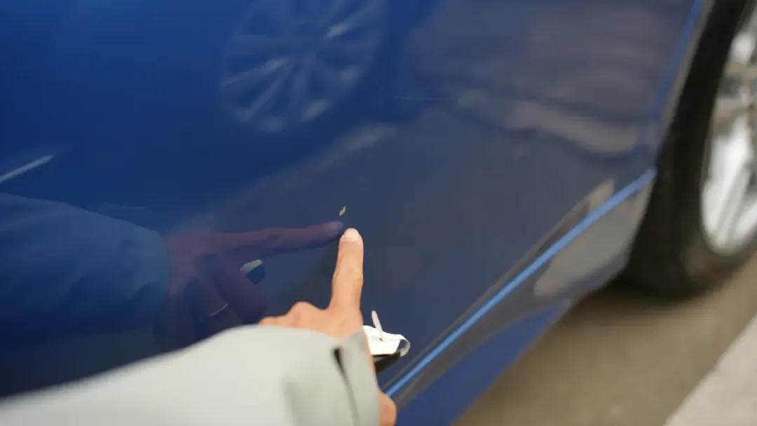 3)右后门连带右后轮眉的一条直线蹭痕,有轻度钣金凹陷,倒影可见;