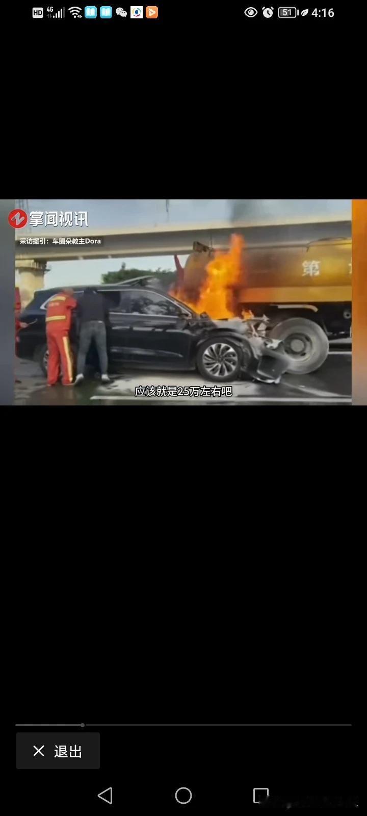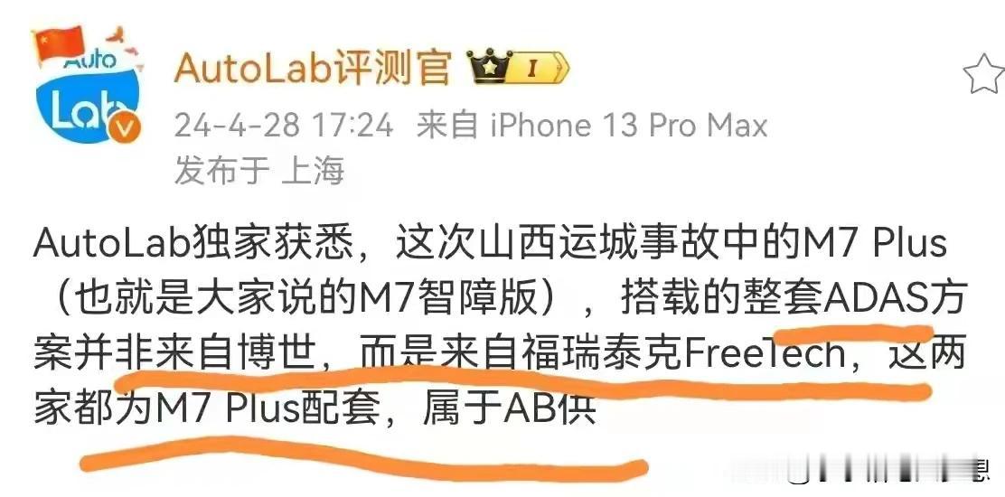问界M7追尾洒水车事故分析: 1.司机可能开了自适应巡航和车道保持辅助,因为自适巡航不能识别静止物体。 2.高速猛烈撞击,撞到增程器油路导致起火(因为文件官方称电池包特性正常)。 3.前方车头起火,后排和车门都没有被撞变形,后排的人估计没有系安全带,两岁的孩子应该也没有配备安全座椅。 4.车辆开启童锁,电路烧断,全车断电,隐形拉手没弹出,导致车门在外面打不开。 5.现场有洒水车,没有用水先灭火,车子完全烧毁,是水用完?很明显,图1是洒水车往前开。 6.洒水车作业,可能属于短暂作业,估计没有摆放警示牌。 最后,命是掌握在自己手中,开车重点还是相信自己吧,不管什么系统都是不可能完善的。 #春日生活打卡季#
