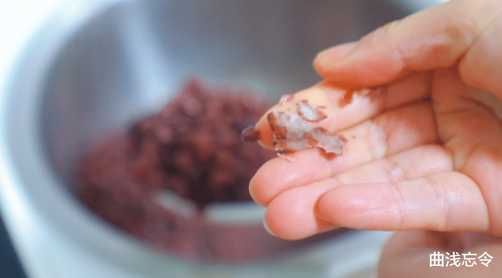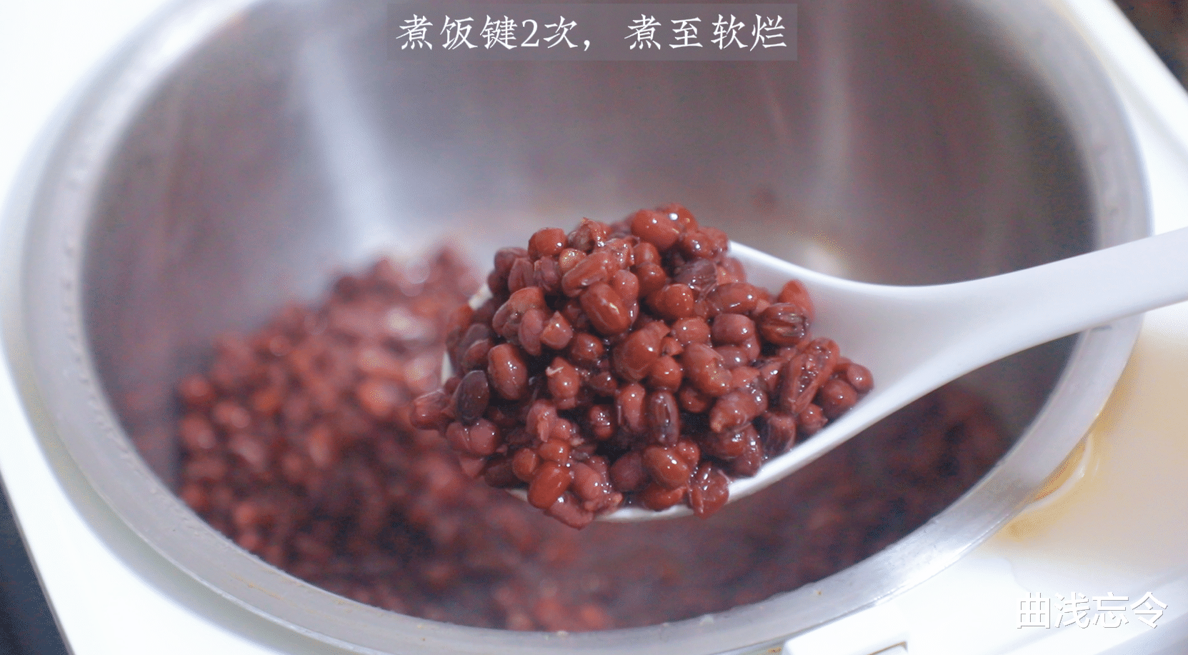 1、处理红豆:红豆加清水浸泡1夜,至能轻松搓破皮的状态。加入适量清水用煮饭模式煮2遍煮熟至软烂。