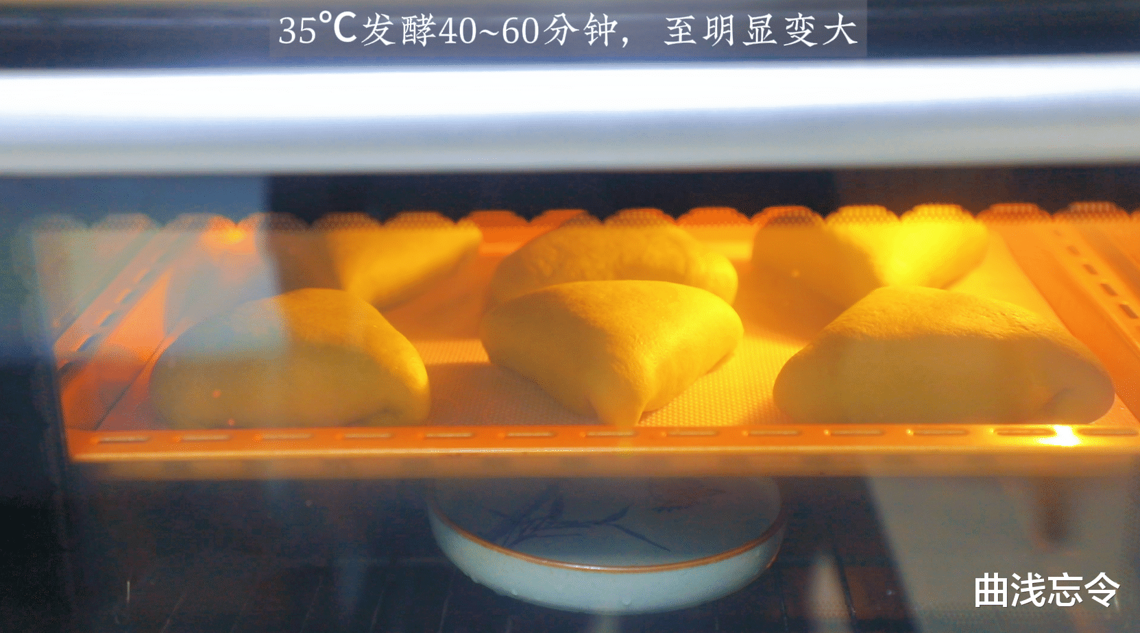 8、二次发酵:将做好的面包翻过来光滑面朝上,放置于烤盘中,放入烤箱发酵模式35℃发酵40~60分钟,至明显变大。烤箱中可放一小碗热水保湿。