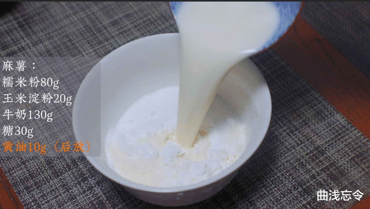 麻薯:糯米粉80g、玉米淀粉20g、牛奶130g、糖30g、黄油10g(后放)