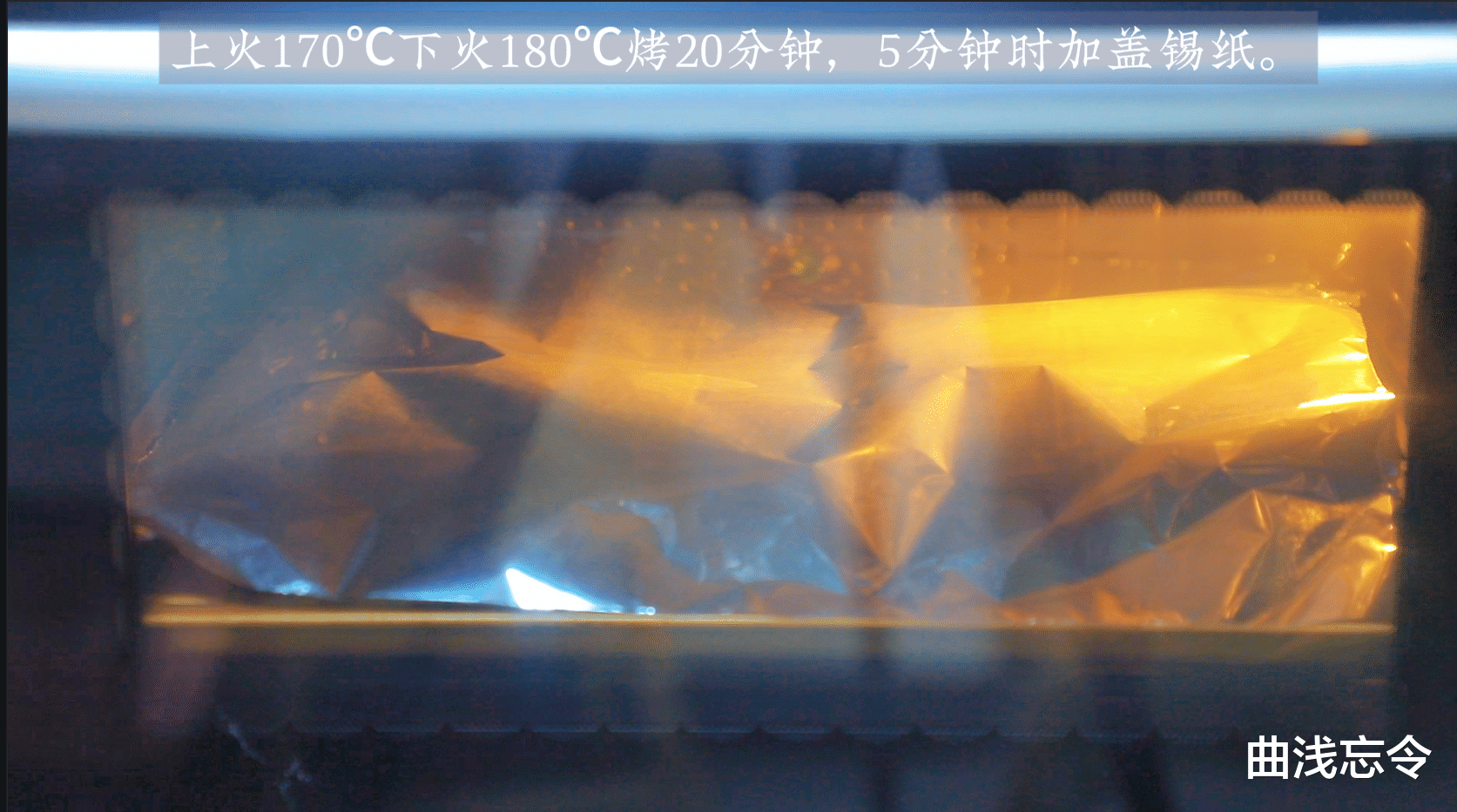 10、烤制:送入提前预热好的烤箱,上火170℃下火180℃烤20分钟左右,5分钟左右加盖锡纸防止过度上色。可根据实际情况调整温度和时间。