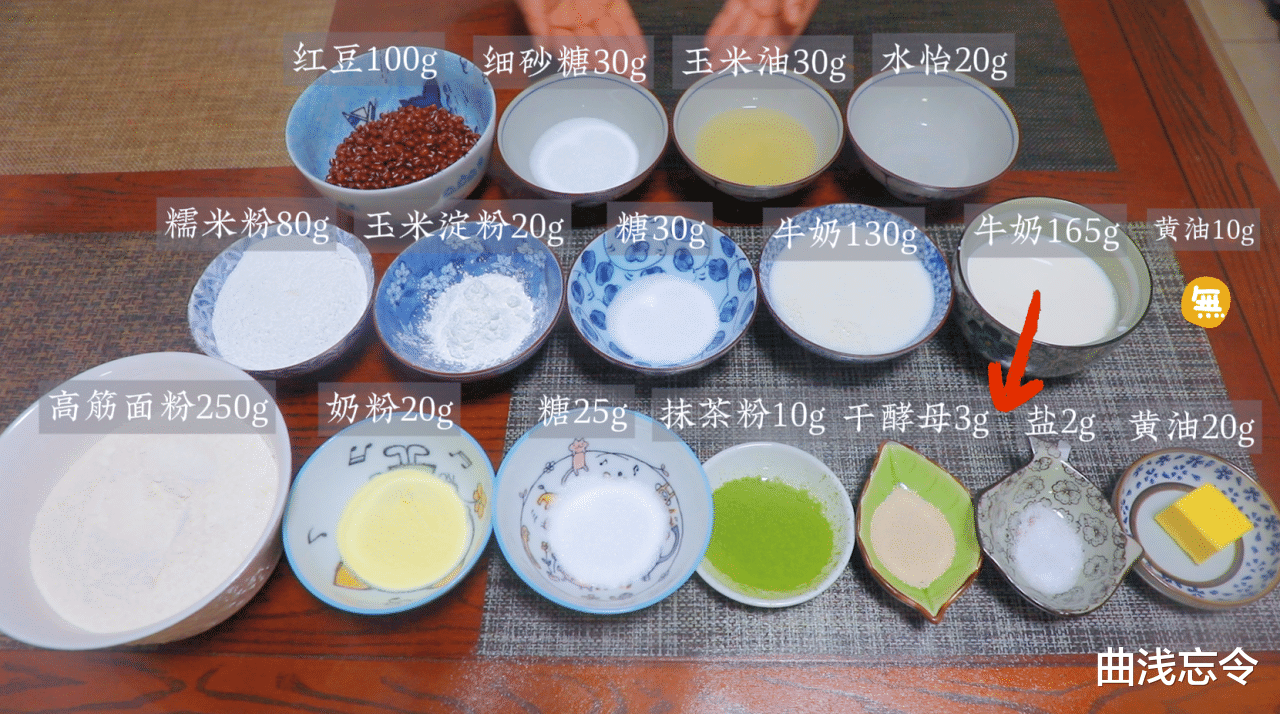 面团:高筋面粉250g、奶粉20g、糖25g、干酵母3g、抹茶粉10g、牛奶165g、盐2g(后放)、黄油20g(后放)