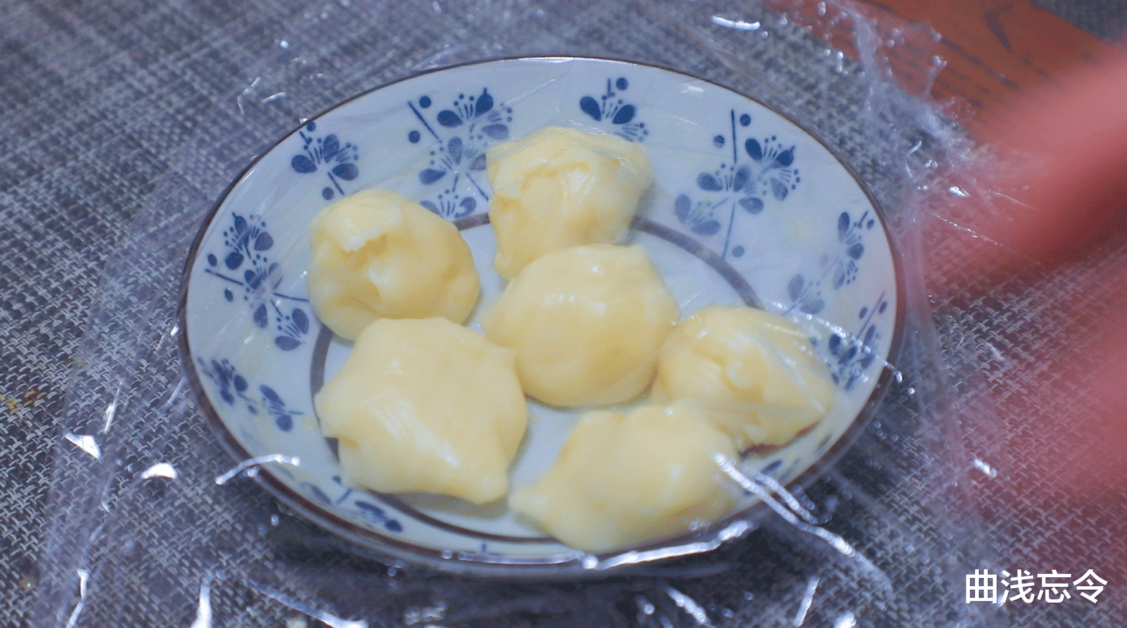 5、做麻薯:趁这个时间来做个麻薯,先将糯米粉、玉米淀粉和糖混合均匀,倒入牛奶,搅拌融化,过筛一遍更细腻,覆盖保鲜膜扎些小孔放入蒸锅蒸15分钟蒸熟,中心位置没有白心就熟了。趁热加入黄油,抓揉融化至充分吸收,然后反复折叠拉扯,至非常细腻丝滑状态,均分成6份,约45g/个,用保鲜膜包裹备用。