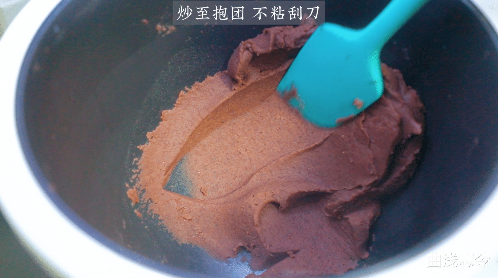 2、炒馅料:连汁水一起倒入破壁机打至细腻的豆沙泥(想做带颗粒状的豆沙馅可省略这个步骤),再炒干水分,呈现抱团且不粘刮刀的状态。贴面覆盖保鲜膜冷藏备用。
