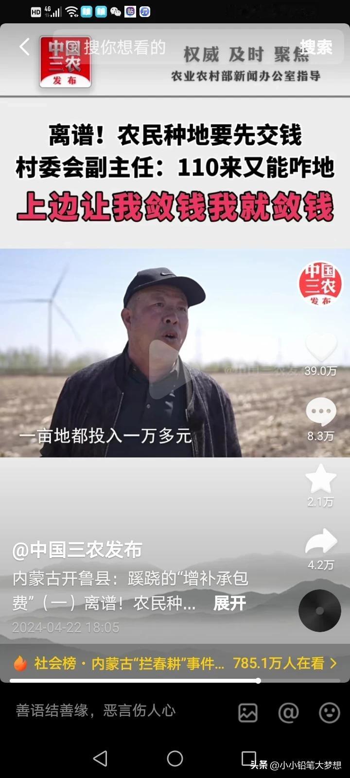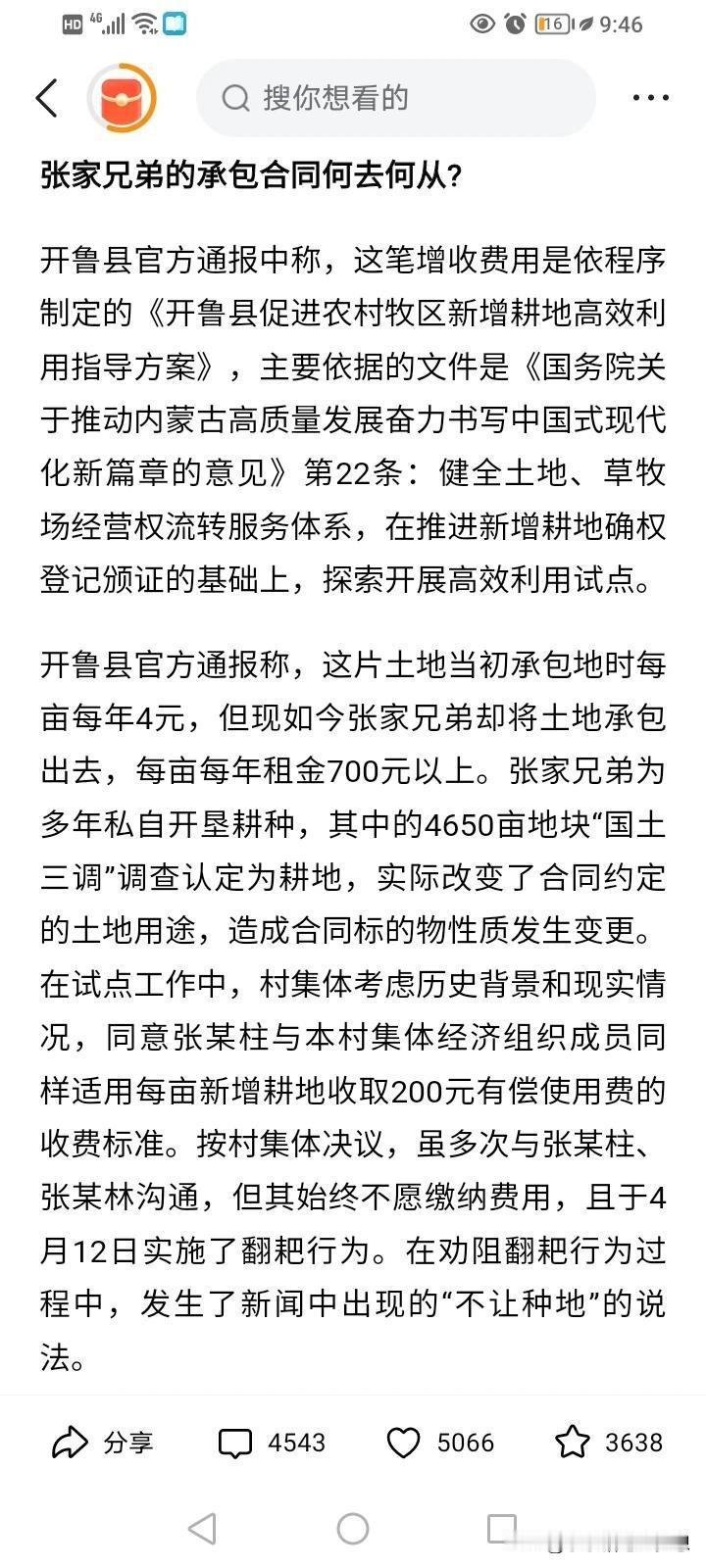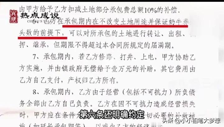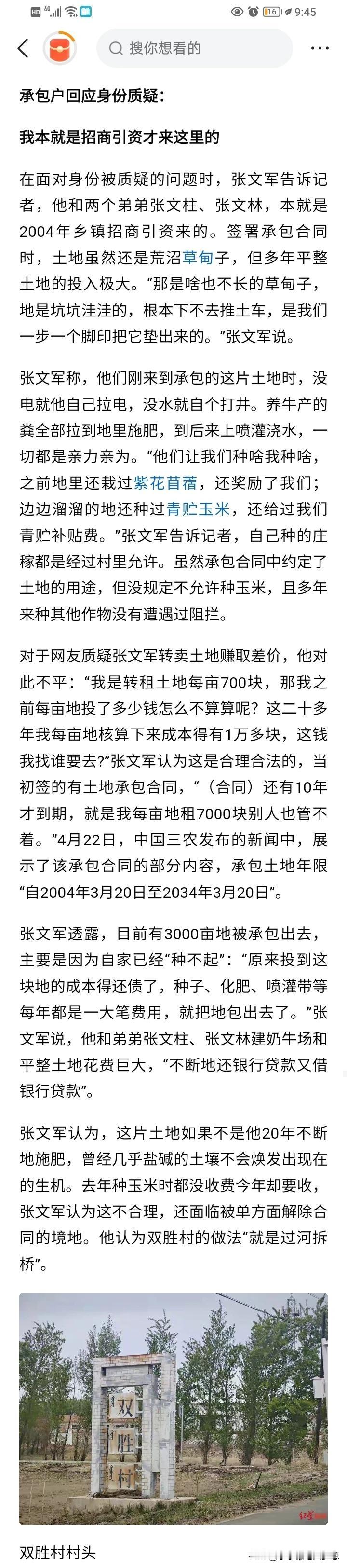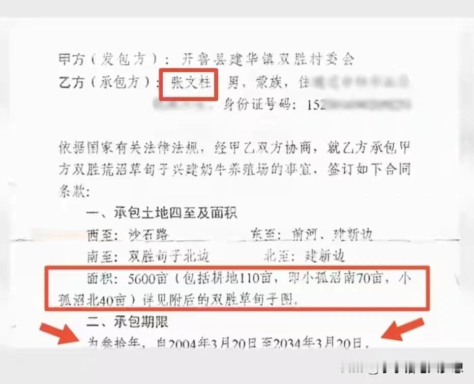开鲁县土地“有偿使用费”最新后续,双胜村终于回应了张氏兄弟的真实身份和事件的五大争议,第一、有偿使用费依据是什么?第二、每亩每年200块钱是怎么决定的?第三、张氏兄弟违规操作这么多年,为什么一直没有阻止?第四、如果解除了合同,那张氏兄弟前期投入又是怎么计算?第五、收的钱给谁? 首先,2004年,张氏兄弟以4元每亩的价格承包的5600亩荒沼甸子,承包期为30年,合同中确实标明承包期内不改变土地用途并保证奶牛养殖头数。 第一、有偿使用费依据是什么? 张氏兄弟已经改变土地使用性质,确认违约,依据国务院文件《开鲁县促进农村牧区新增耕地高效利用指导方案》,针对“国土三调”较“国土二调”新增加的耕地,村集体可以收取有偿使用费用。 第二、每亩每年200块钱是怎么决定的? 这是由村集体决定的因为土地属于村集体所有,村民自治,村代表参加会议,最后做‘四议两公开’程序决定。 本来决定张文柱按300每亩收取,因为他改变土地性质,但考虑到招商引资,所以一视同仁,对于新增耕地的都收取200每亩的有偿使用费。 第三、张氏兄弟违规操作这么多年,为什么一直没有阻止 他们一开始是和紫花苜蓿,但是这种作物需要换茬轮作,所以他们第二年会种别的作物,村委会的人问他,他说种玉米是当做青贮,村里虑到他们养殖的奶牛,所以就没有限制和阻止,但没想到他们一直拿草地当耕地使用。 第四、如果解除了合同,那张氏兄弟前期投入又是怎么计算? 张氏兄弟称经过20年土地改良,平均每亩地投入的成本是一万块。 一万块是因为他把养牛的牛粪堆到土里面去了,本来这些牛粪他可以卖钱的,一方能卖个80块钱,但是村民却说:“他是吹牛的,一方能卖个35块钱都不错了,哪个地方能收80块钱一方?人家要多少,他给多少?” “他还说他没收回成本,4000亩耕地,700块钱/亩,租出去好几年了,一年几百万,早就收回本!” “这地承包人实际上是张文柱和张文林,实际承包人不是他张文军!” 4月29日,村干部赵某对此反问道,“你问问他,要是80块钱一方牛粪,他要多少我给他拉多少,他收吗?” 赵某告诉记者,虽然张家兄弟是当年乡镇招商引资来的,但其不认可对方的巨额资金成本说法,并认为多年转租土地早就收回成本。“4000多亩耕地,每亩每年租出去700块朝上,每年几百万收入肯定是有的。” 第五、收的钱给谁? 双胜村新增耕地:13992亩,6571亩已缴款,张氏兄弟的4650亩没有交,这些钱将成为村集体的资金。村集体已经向法院提起诉讼,现在是前期的调解阶段。 另外,张文柱的身份也被核实了,他确实是开鲁县第九届、第十届政协常委,但现已卸任。 看了这份合同,我觉得私自变耕地就违约了呀,村集体维护自己的利益,我觉得也没毛病啊,我现在越来越好奇,这个法院怎么判了。 #春日生活打卡季#