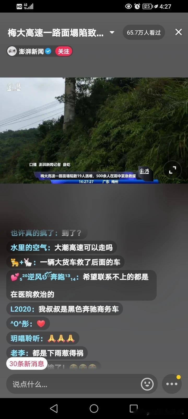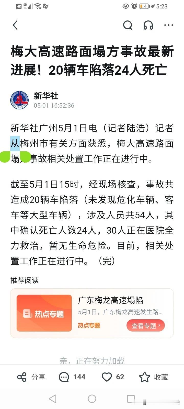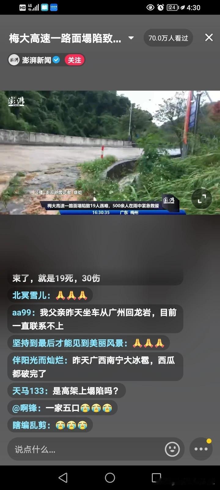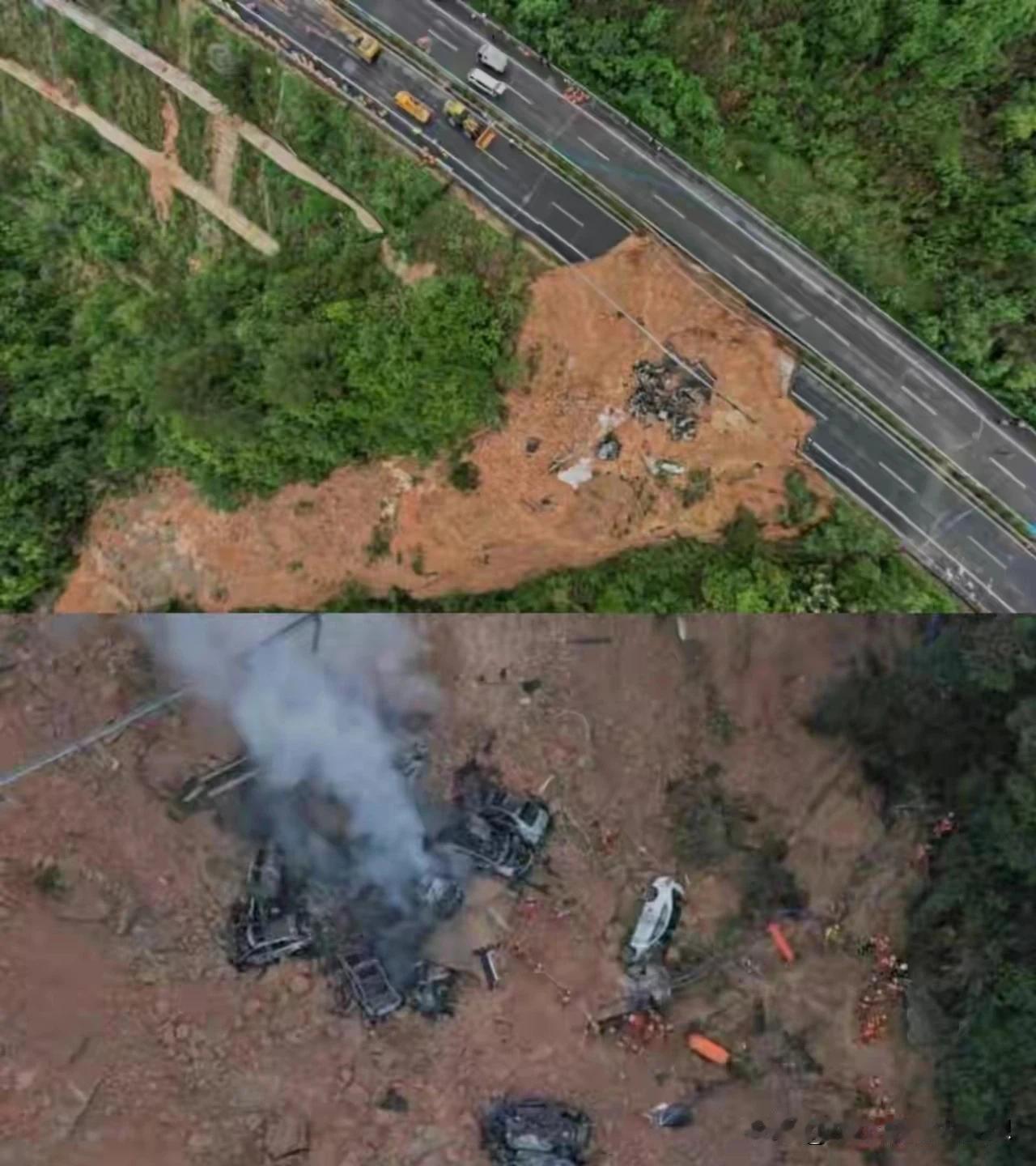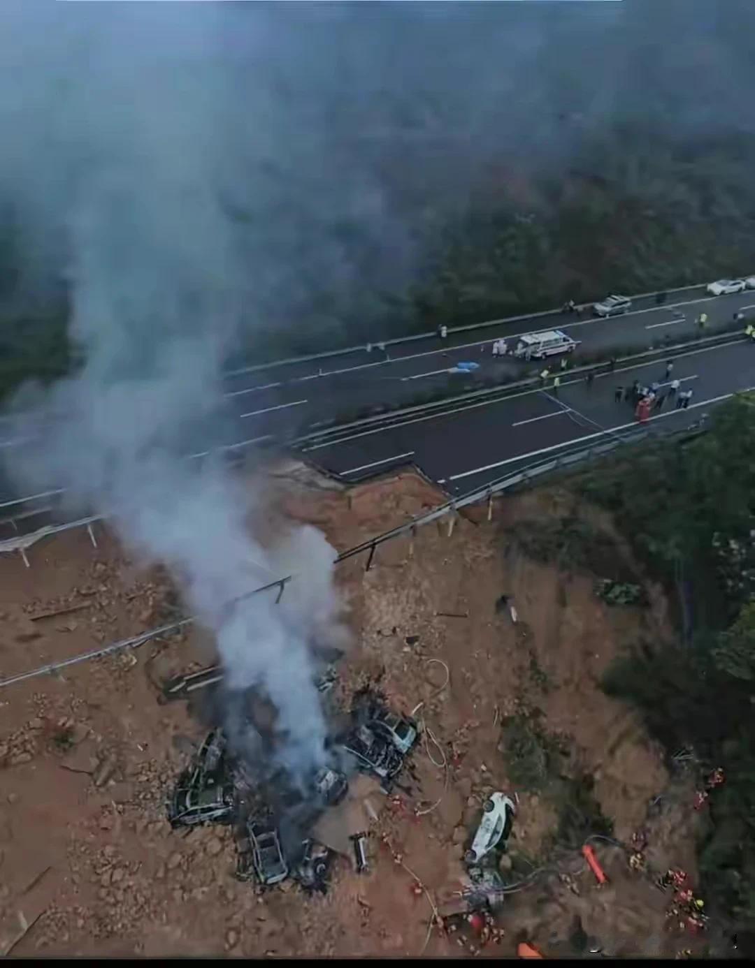 梅大高速最新情况,死了24个,伤了30个,不是18辆而是20辆,因为都被埋在下面了,我特意去看了一下现场直播,得到了很多消息:第一、塌方的地方长将近18米,塌方的面积将近185平,车辆滑落有7~8米深。 第二、出动了多个应急部门大概500人参与了现场救援,包括公安、应急、消防、卫健、交通、矿山救护队等。 第三、在网上发文“找云A488**车牌”,称车上坐有叔叔一家五口的网友已经前往事发现场了。 第四、在网上发文“有人有见到粤B8M2**这辆车吗?”这位网友说一车人也失联了,手机电话全部关机,但目前记者私信他,但没联系上,还没有得到最新消息。 第五、广东连日暴雨,路基被泡软,塌方的时候先掉下去的车被活埋,后面的掉下去的全部也堆在一起烧起来了,消防救援队后面新增的死者都是在泥巴里把他们挖出来。 第六、去年这个路段也曾经发生过塌方。 第七、血库告急,不过,很多热心市民也冒着大雨前往捐血了。 第八、因为塌方是半夜两点钟发生的,塌方之后现场听到了爆炸声,后面的车主发现不对劲后,所以有车主停车才发现前面冒起了浓烟,火光冲天,所以勇敢的将后面的车拦了下来。 唉,五一长假第一天,听到这样的消息,真的心疼,因为看到这些被烧焦的车,几乎都剩空壳,试想一下以100多米的高速冲下去,最先冲下去的车几乎就完了,想一下在前段路冲下去后面紧跟着泥土就活埋了,这生还率真的很低的,而且这一灭是一整个家庭。 最近广东的天气真的很不寻常,龙卷风,持续大半个月暴雨,洪水,冰雹,所以大家如果走靠山路时候,还是多注意一下,避免道路塌方,高山落石,山泥倾泻。。。 愿生者坚强,死者安息。