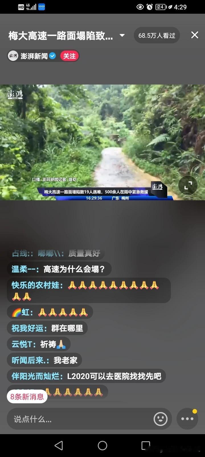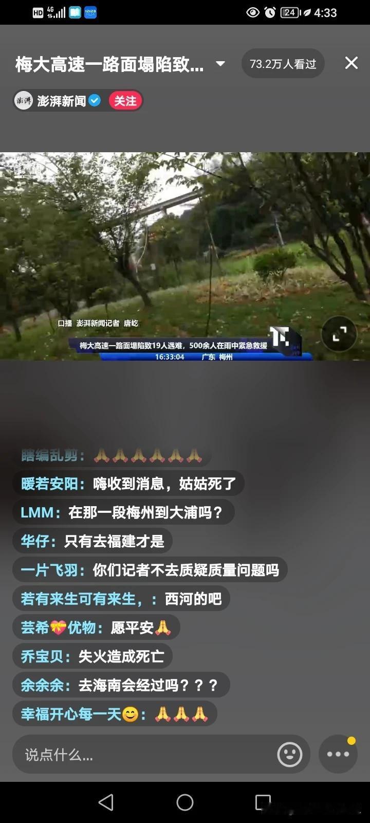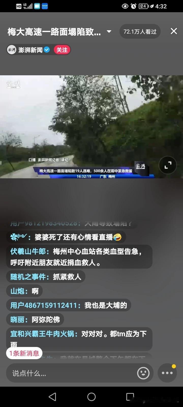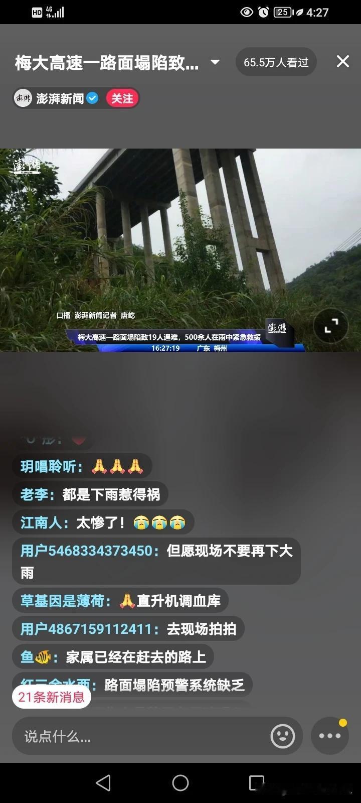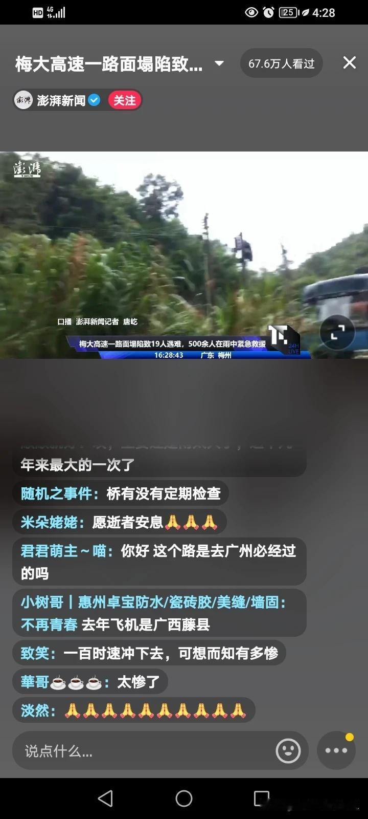 梅大高速最新情况,死了24个,伤了30个,不是18辆而是20辆,因为都被埋在下面了,我特意去看了一下现场直播,得到了很多消息:第一、塌方的地方长将近18米,塌方的面积将近185平,车辆滑落有7~8米深。 第二、出动了多个应急部门大概500人参与了现场救援,包括公安、应急、消防、卫健、交通、矿山救护队等。 第三、在网上发文“找云A488**车牌”,称车上坐有叔叔一家五口的网友已经前往事发现场了。 第四、在网上发文“有人有见到粤B8M2**这辆车吗?”这位网友说一车人也失联了,手机电话全部关机,但目前记者私信他,但没联系上,还没有得到最新消息。 第五、广东连日暴雨,路基被泡软,塌方的时候先掉下去的车被活埋,后面的掉下去的全部也堆在一起烧起来了,消防救援队后面新增的死者都是在泥巴里把他们挖出来。 第六、去年这个路段也曾经发生过塌方。 第七、血库告急,不过,很多热心市民也冒着大雨前往捐血了。 第八、因为塌方是半夜两点钟发生的,塌方之后现场听到了爆炸声,后面的车主发现不对劲后,所以有车主停车才发现前面冒起了浓烟,火光冲天,所以勇敢的将后面的车拦了下来。 唉,五一长假第一天,听到这样的消息,真的心疼,因为看到这些被烧焦的车,几乎都剩空壳,试想一下以100多米的高速冲下去,最先冲下去的车几乎就完了,想一下在前段路冲下去后面紧跟着泥土就活埋了,这生还率真的很低的,而且这一灭是一整个家庭。 最近广东的天气真的很不寻常,龙卷风,持续大半个月暴雨,洪水,冰雹,所以大家如果走靠山路时候,还是多注意一下,避免道路塌方,高山落石,山泥倾泻。。。 愿生者坚强,死者安息。
